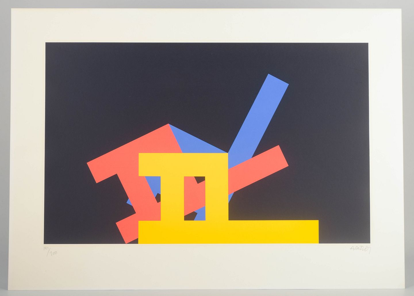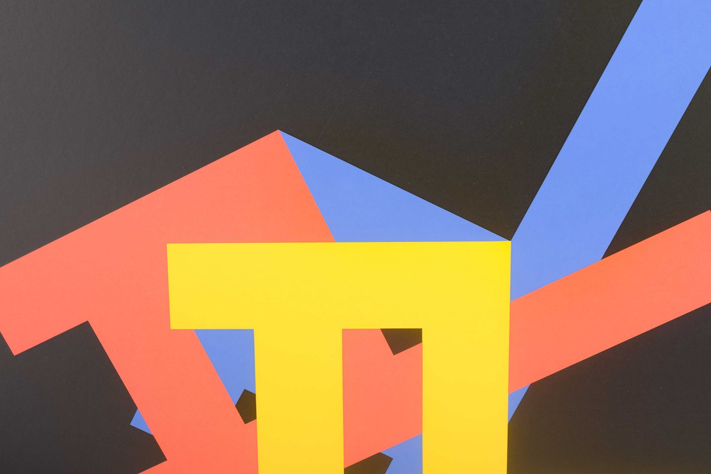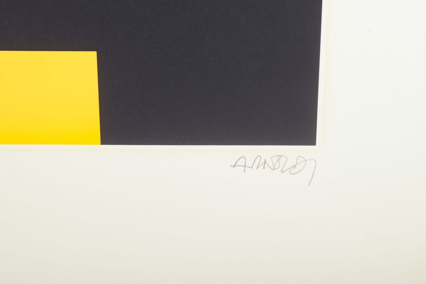 Abstrakt komposition bestående af overlappende geometriske former i gult, rødt og blåt på sort baggrund. Den stærke kontrast mellem farverne og de enkle, arkitektoniske elementer understreger Arnoldis karakteristiske minimalistiske formsprog.
