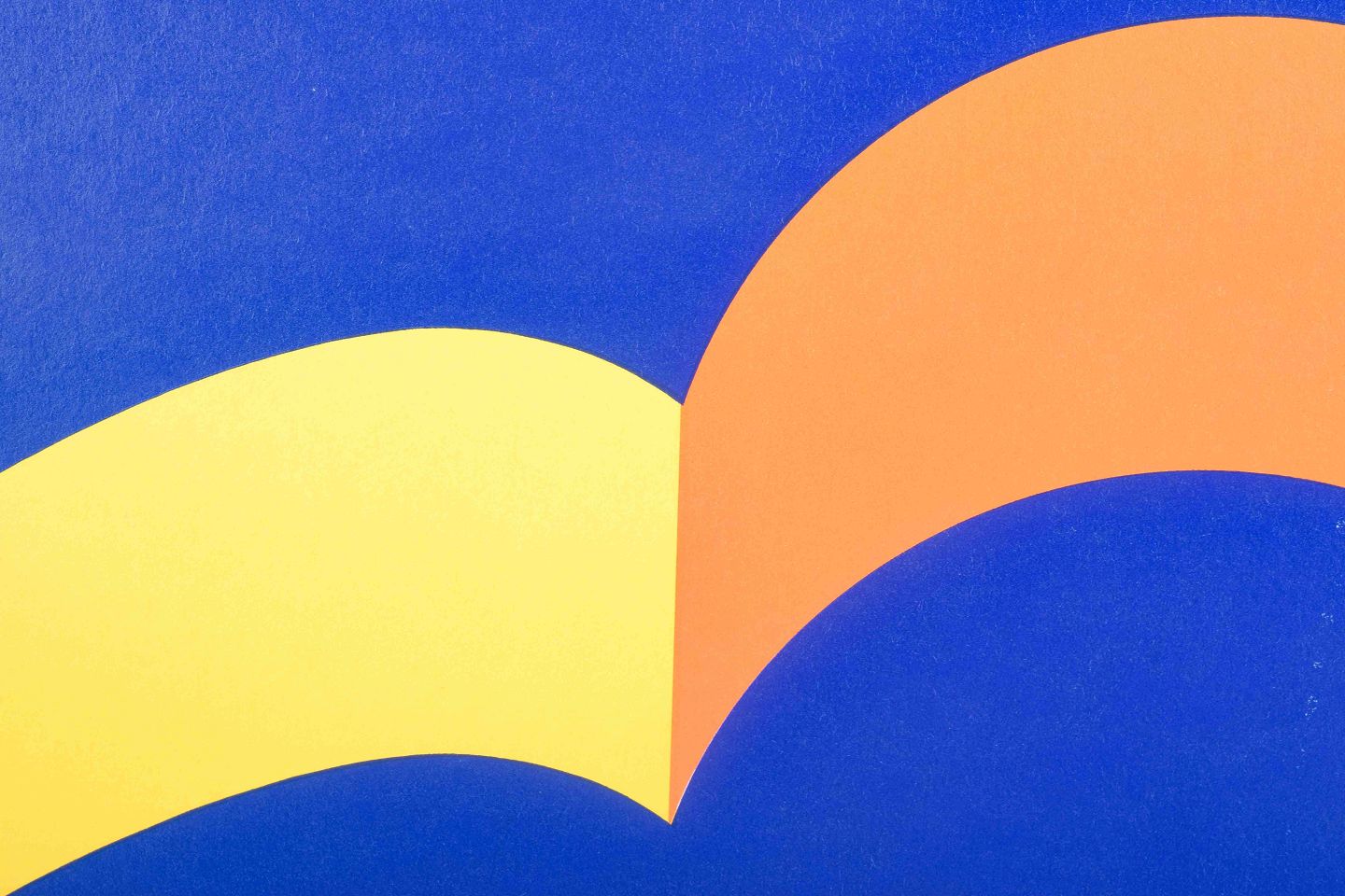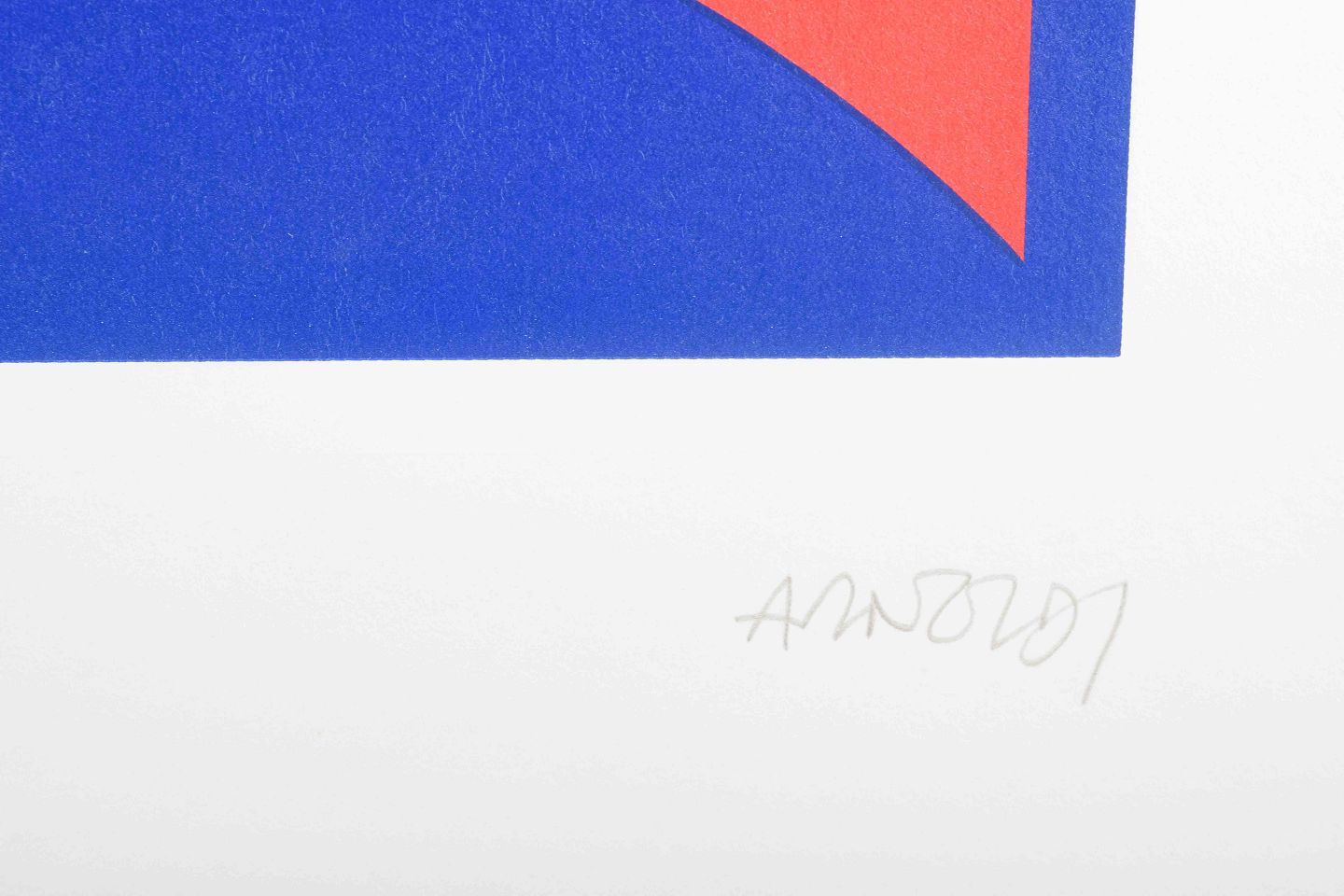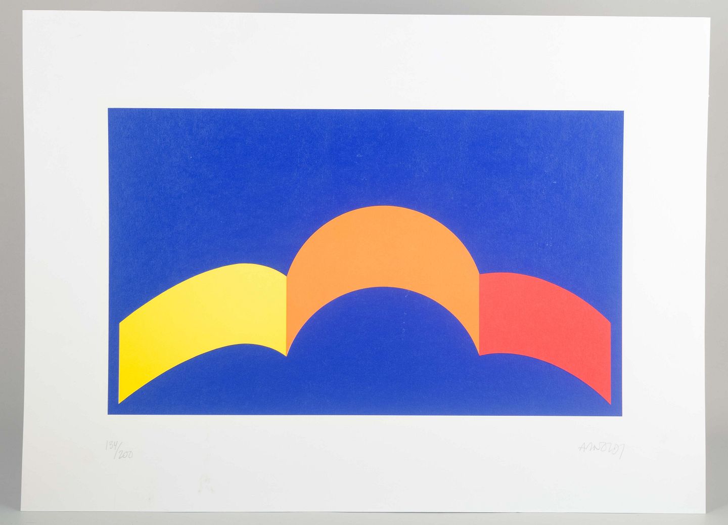 Grafisk komposition i klare primærfarver, hvor gule, orange og røde buede former skaber en rytmisk kontrast mod en intens blå baggrund. Værket fremstår med Arnoldis karakteristiske minimalistiske formsprog, hvor rene linjer, stærke farvefelter og enkelhed er i centrum.
