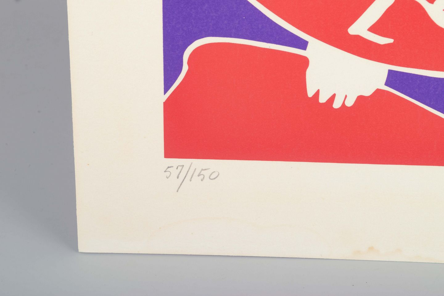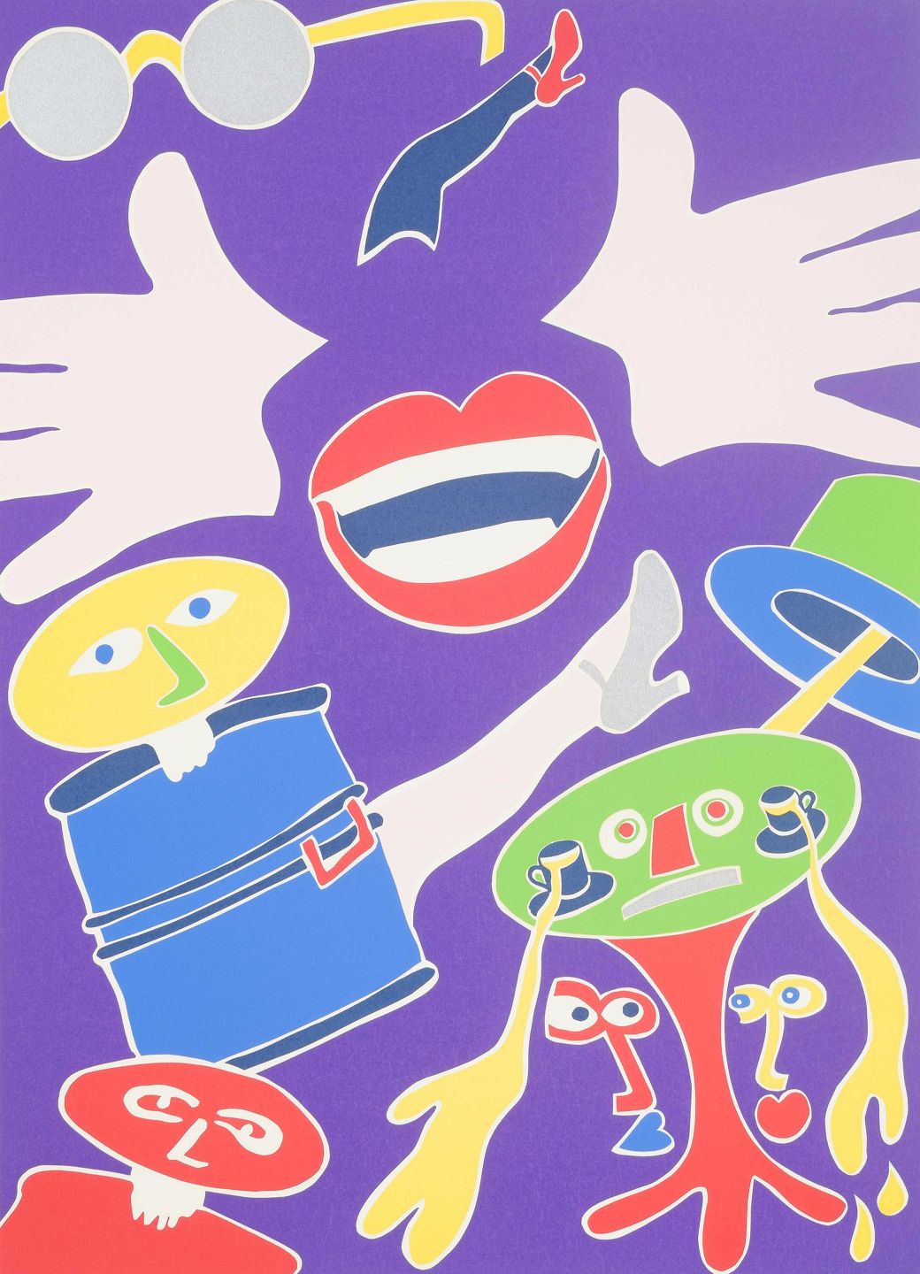 Kompositorisk og fabulerende motiv med surrealistiske figurer, hænder, mund og stiliserede hoveder i stærke kontrastfarver. Værket udstråler Krøjers karakteristiske leg med popkunst, humor og visuel poesi, hvor flader og figurer brydes op i en livfuld, fortællende helhed.