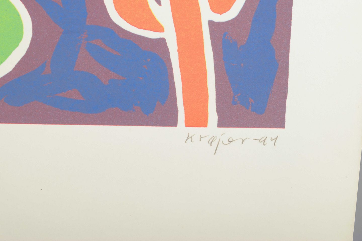 Farverigt og dekorativt komposition med hus, træer og blomster i et stiliseret formsprog. Værket bærer præg af Krøjers karakteristiske leg med farveflader, kontraster og organiske konturer, som skaber en umiddelbar og livfuld stemning.