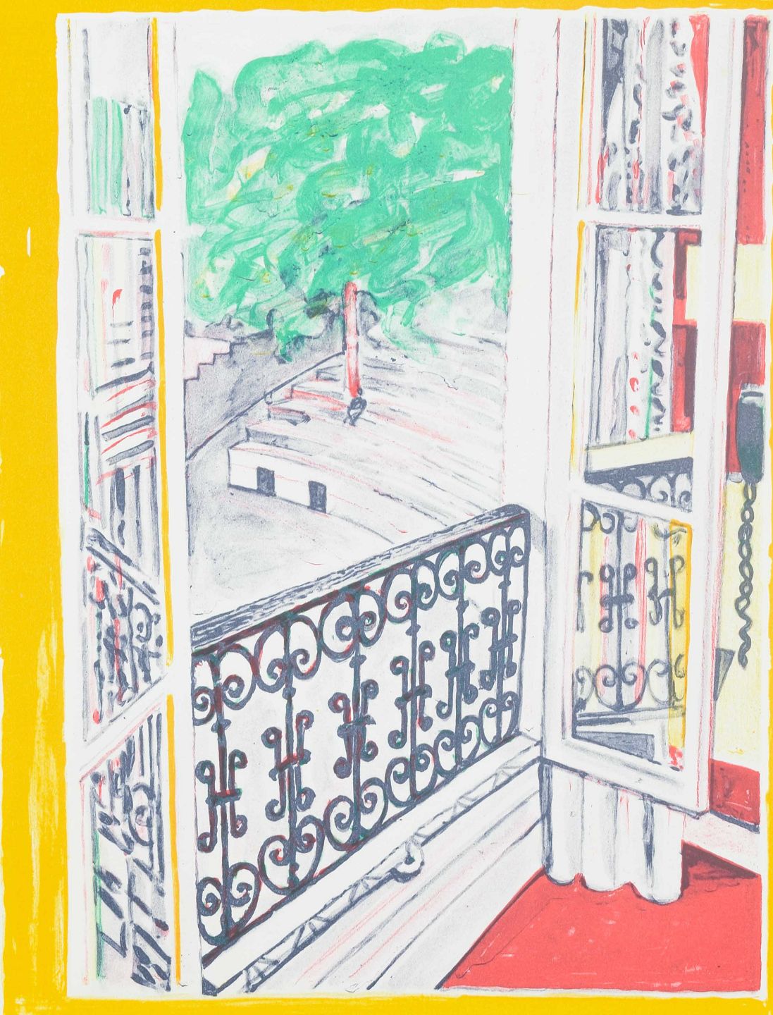Et farverigt og detaljeret værk, der skildrer et kig ud gennem en fransk altandør med smedejernsgelænder, hvor lys og rum åbner sig mod en grøn trækrone og en stille gade. Kompositionen balancerer mellem det intime interiør og det urbane uderum, hvilket skaber en poetisk oplevelse af nærvær og afstand.