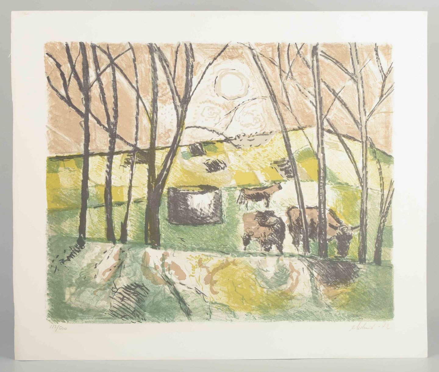 Farvelitografi med køer i landskab, 1972.