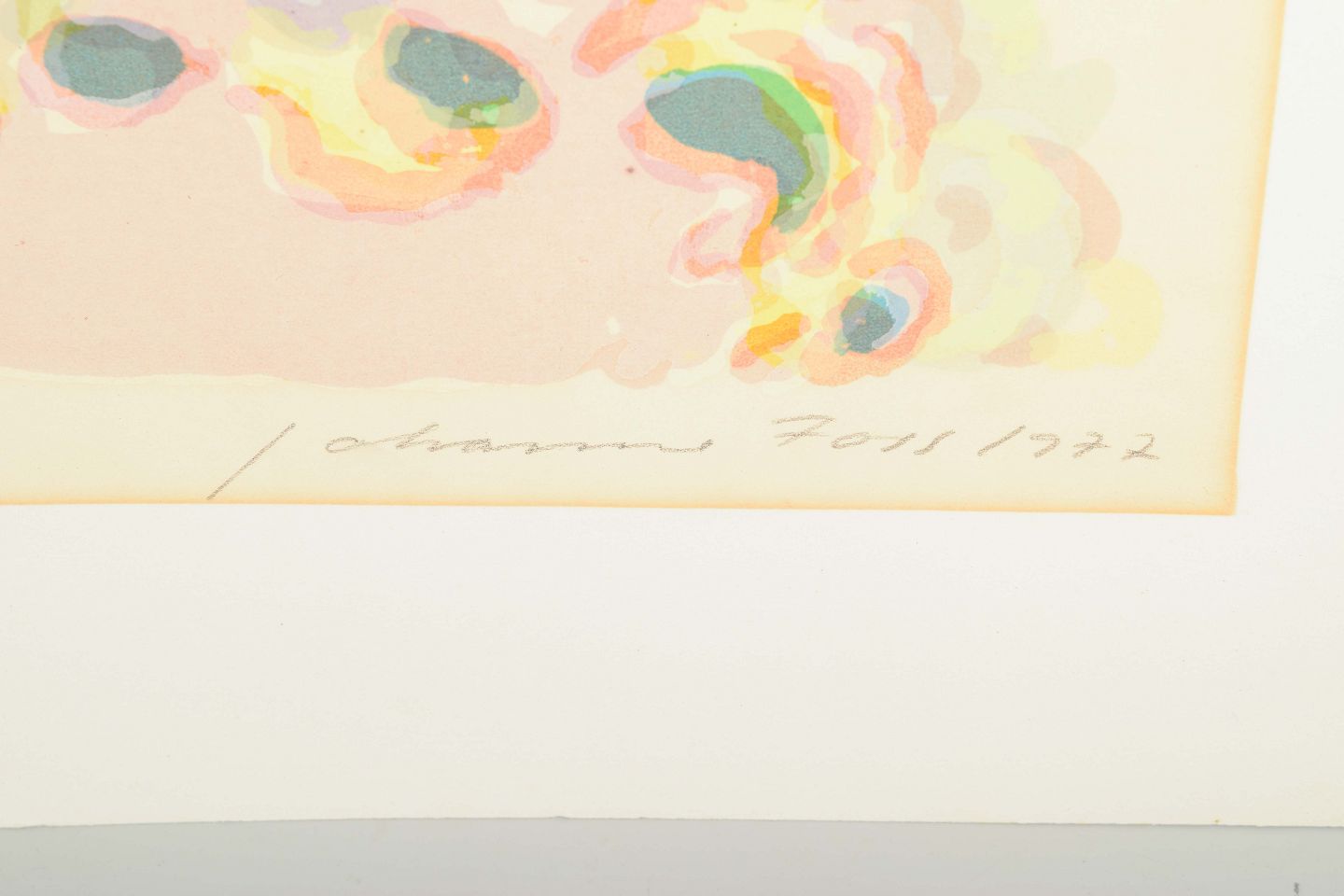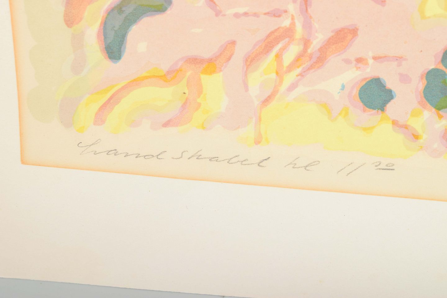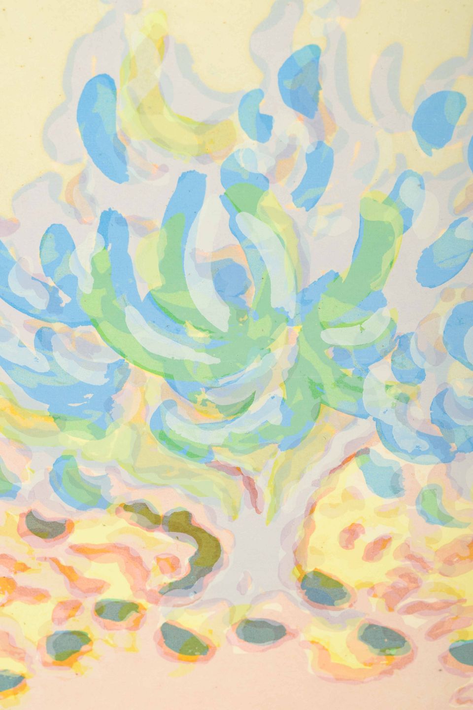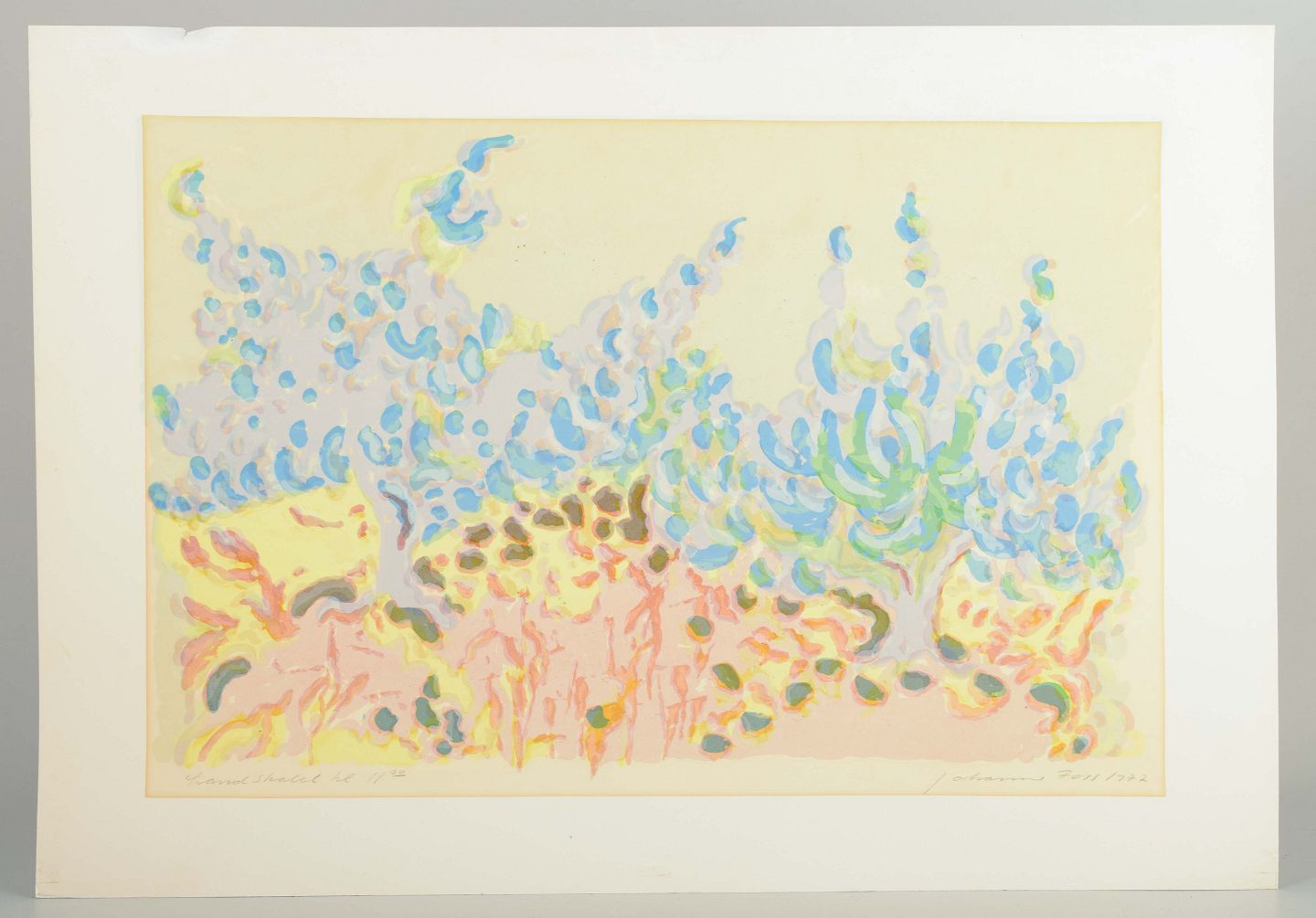 Et poetisk og farverigt farvelitografi med organiske og abstrakte former i blå, grønne, rosa og gule nuancer. Værket har en let og drømmende karakter, hvor penselstrøgene danner rytmiske mønstre og antyder et landskab i bevægelse.