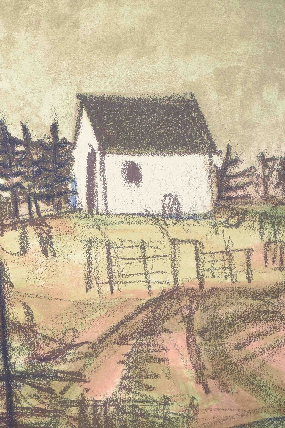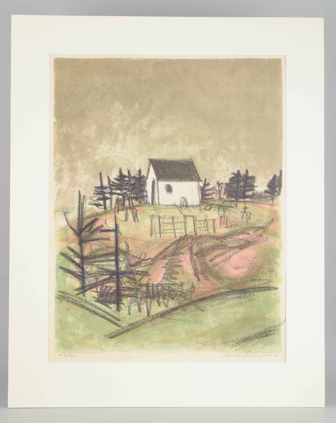 Et stemningsfuldt og poetisk litografi, der viser et hvidt hus placeret på en bakketop omgivet af træer og hegn. Værket er udført i Søndergaards karakteristiske enkle og stoflige formsprog, hvor bløde farvetoner og skitseagtige streger skaber en rolig og let drømmende atmosfære.