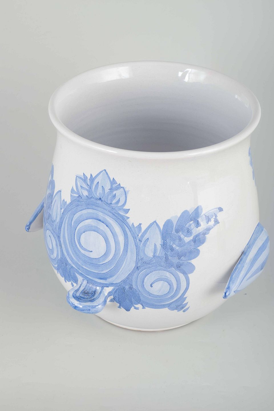 Organisk formet urtepotte-skjuler i hvidglaseret fajance med håndmalet blå spiral- og blomstermotiv.