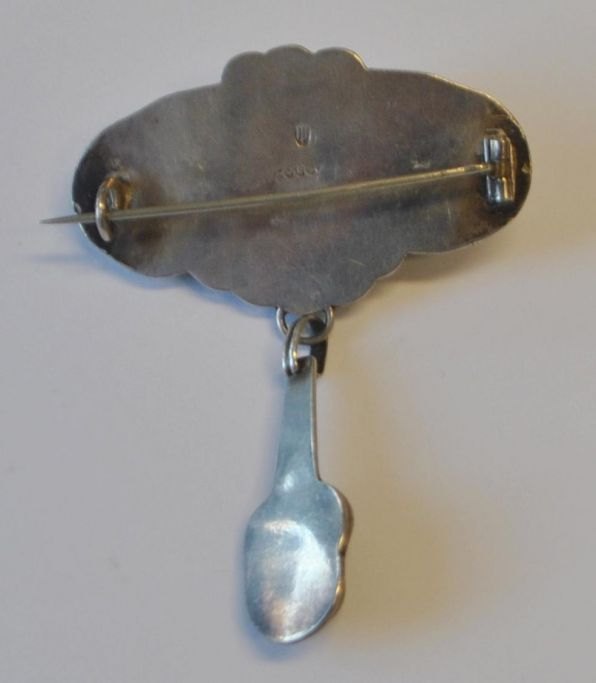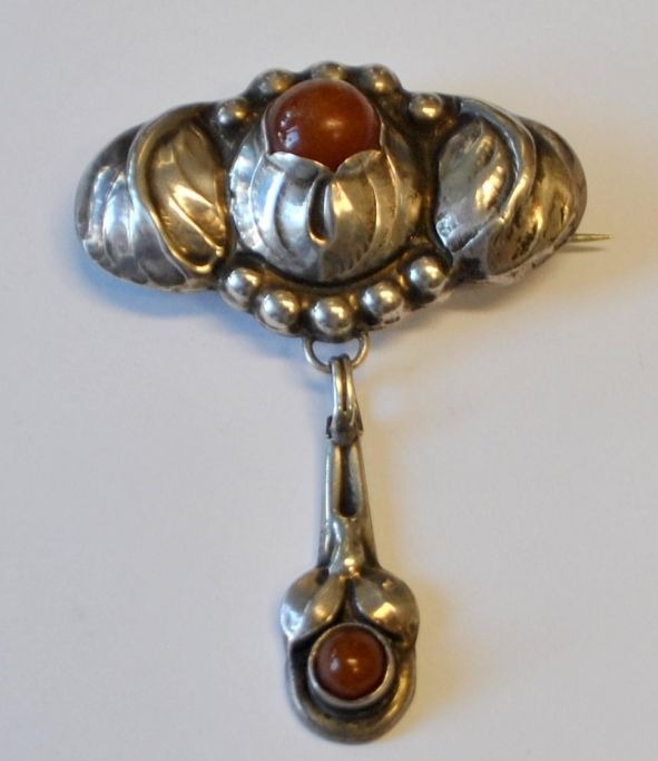Dansk jugend brosche i sølv med rav, 20. årh. Hans Jensen & Co, København (efter 1928).Dekoration i form af bladværk. Stemplet 830 og mestermærker. B.: 5 cm. H.: 5 cm.Emne nummer: 28325