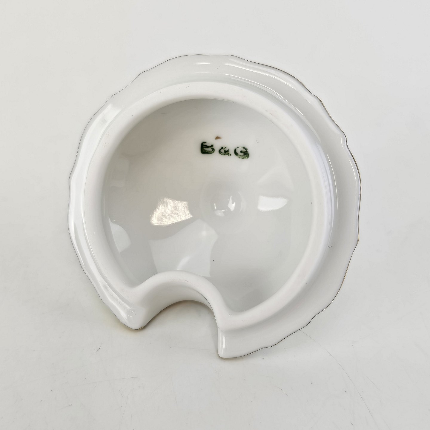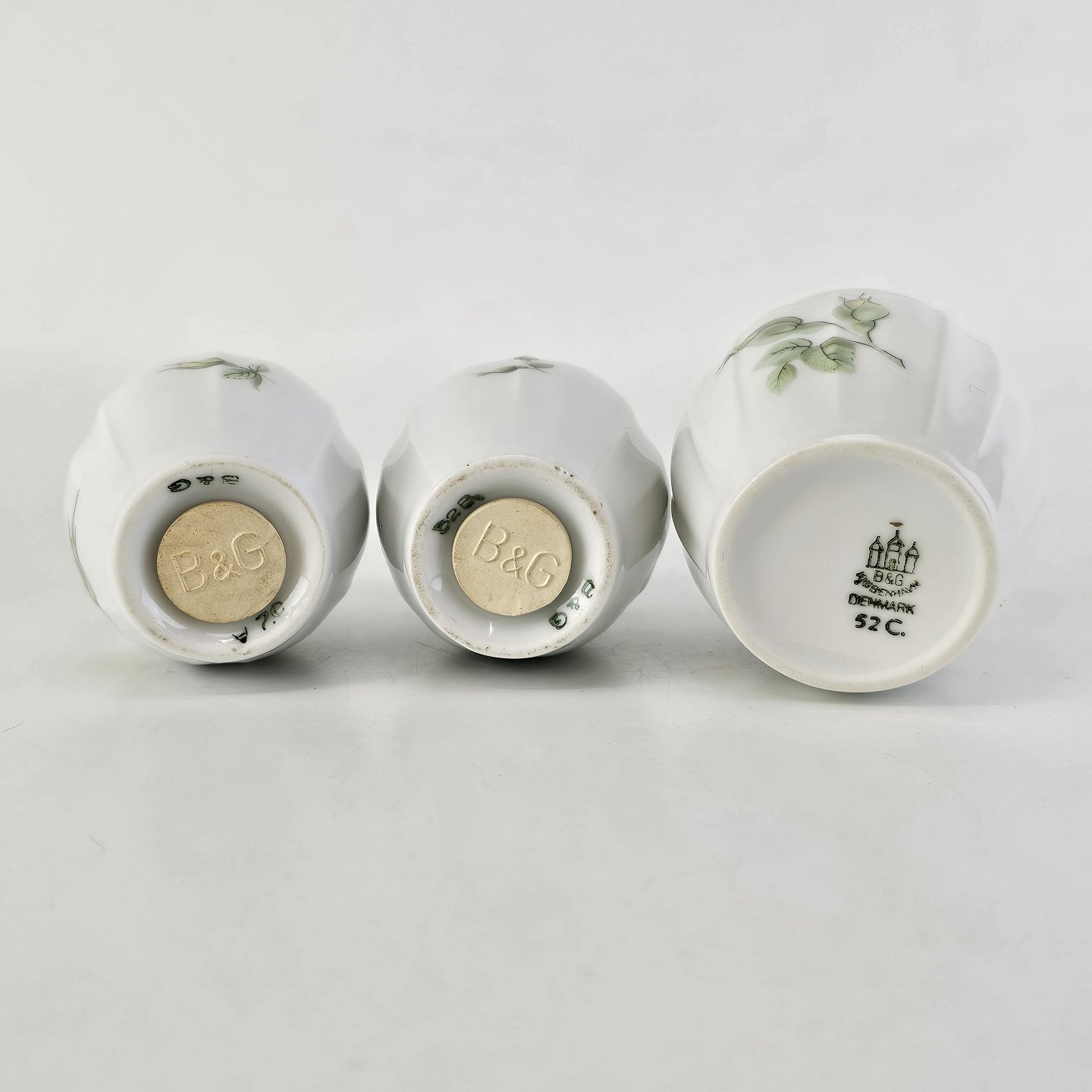 Sæt til salt, peber og sennep med tilhørende tallerken i porcelæn fra stellet KlitroseSaltbøsse nr. 52A, 1. sortering