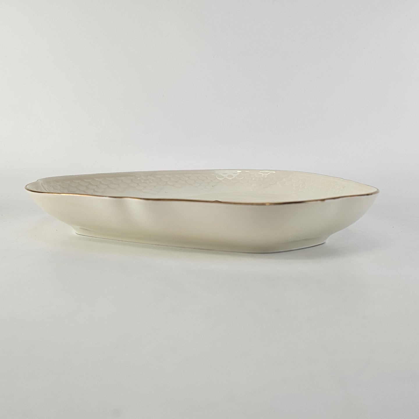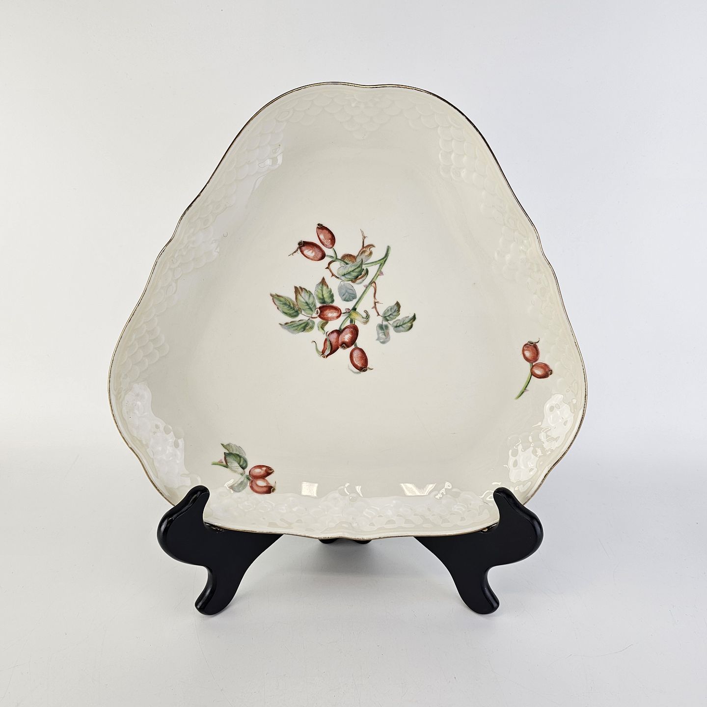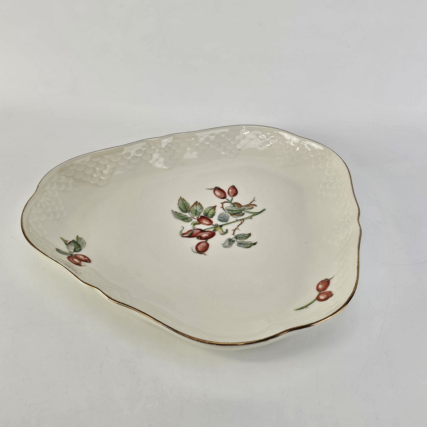 Balder er cremefarvet porcelæn i skælform, dekoreret med hyben og guldkant.