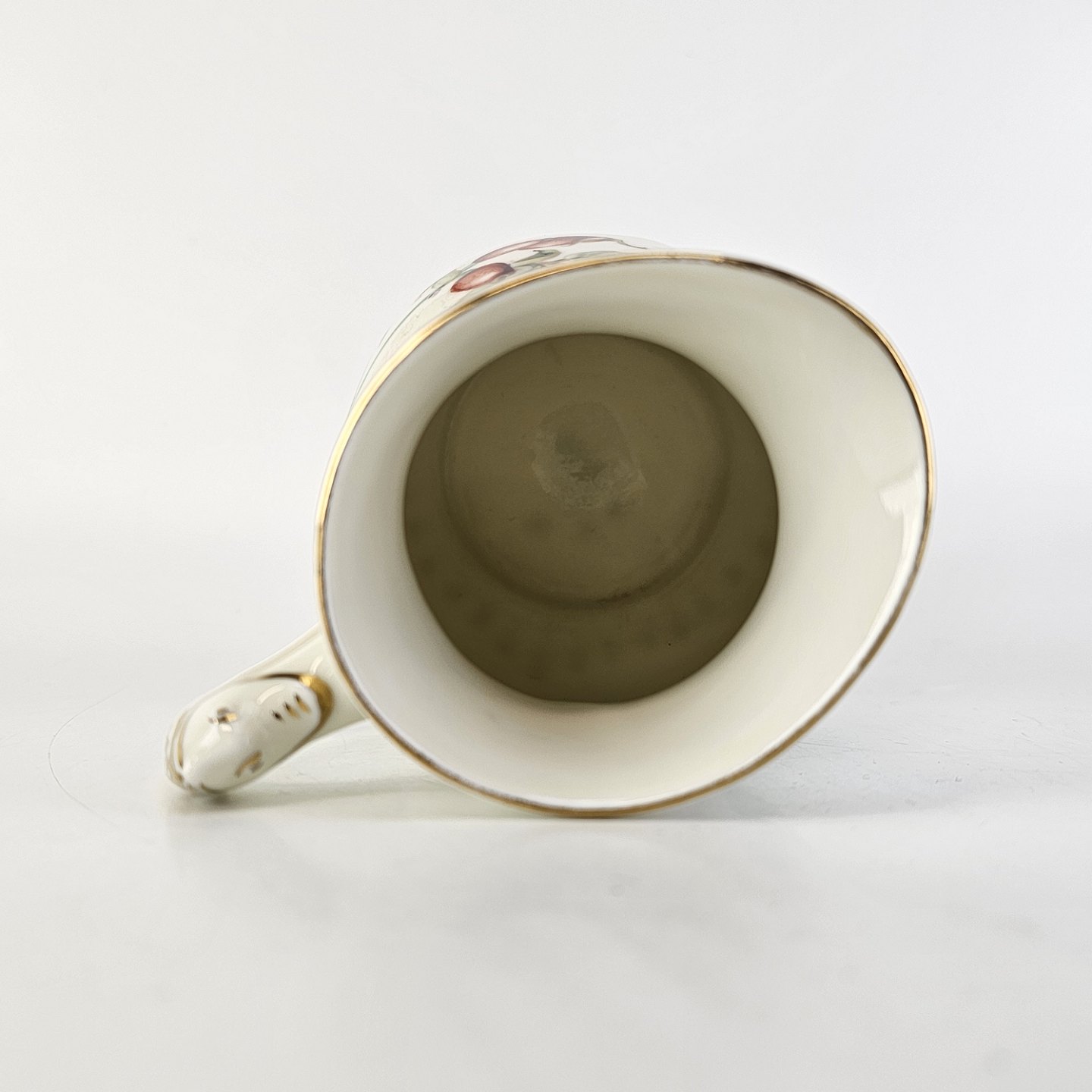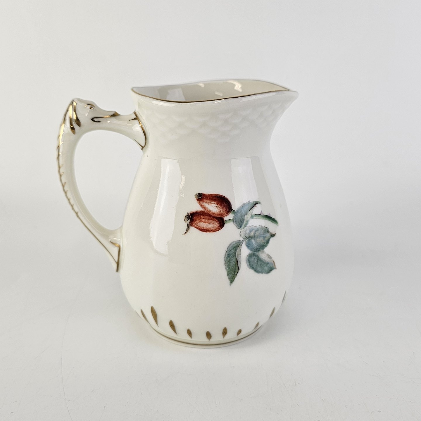 Balder er cremefarvet porcelæn i skælform, dekoreret med hyben og guldkant.