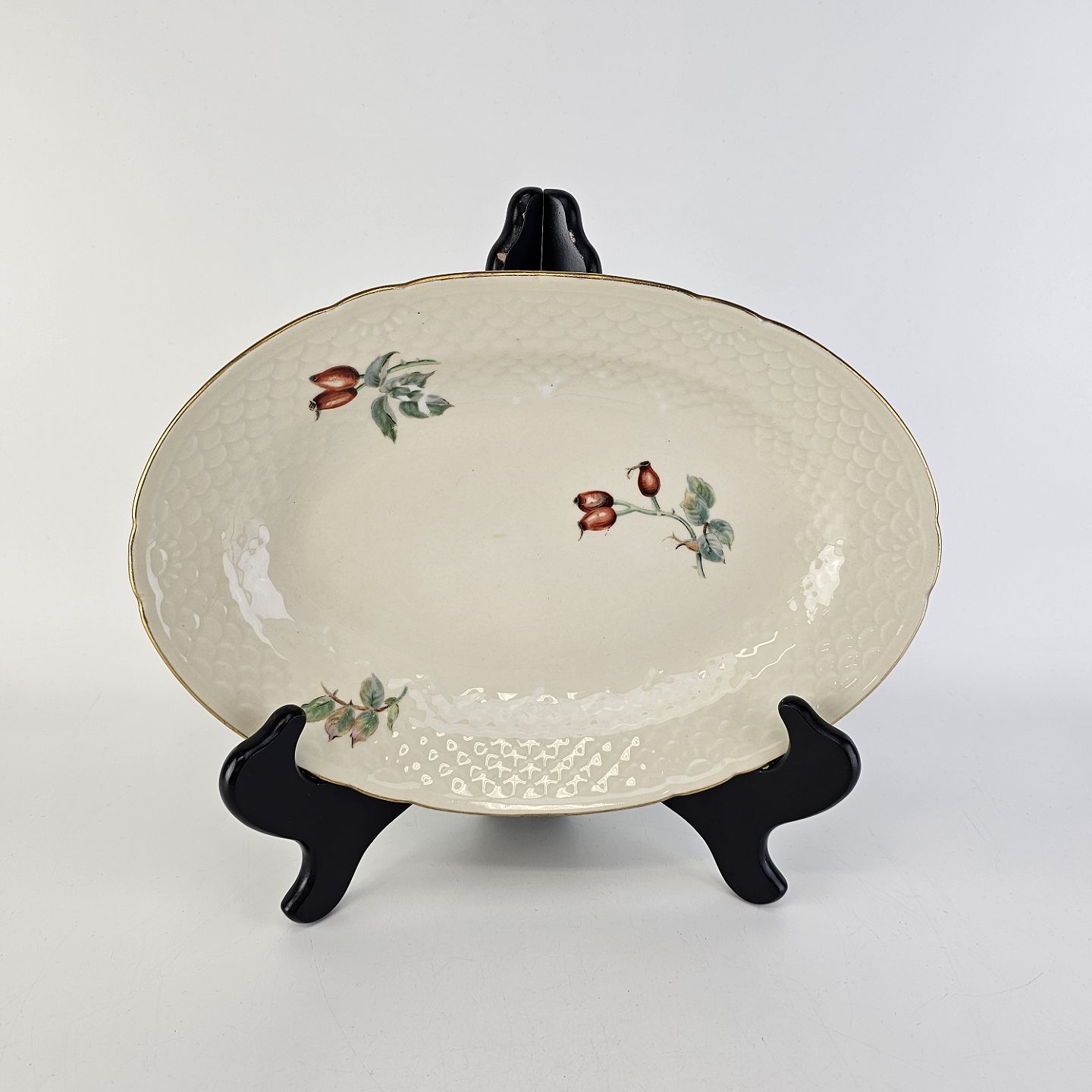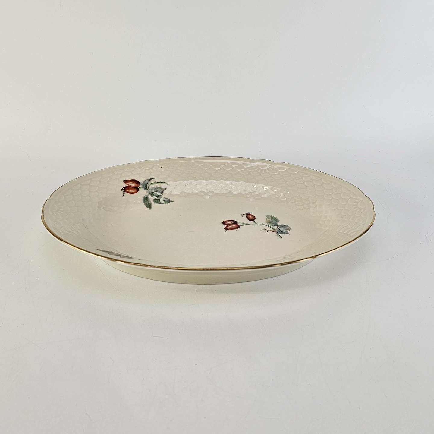 Balder er cremefarvet porcelæn i skælform, dekoreret med hyben og guldkant.