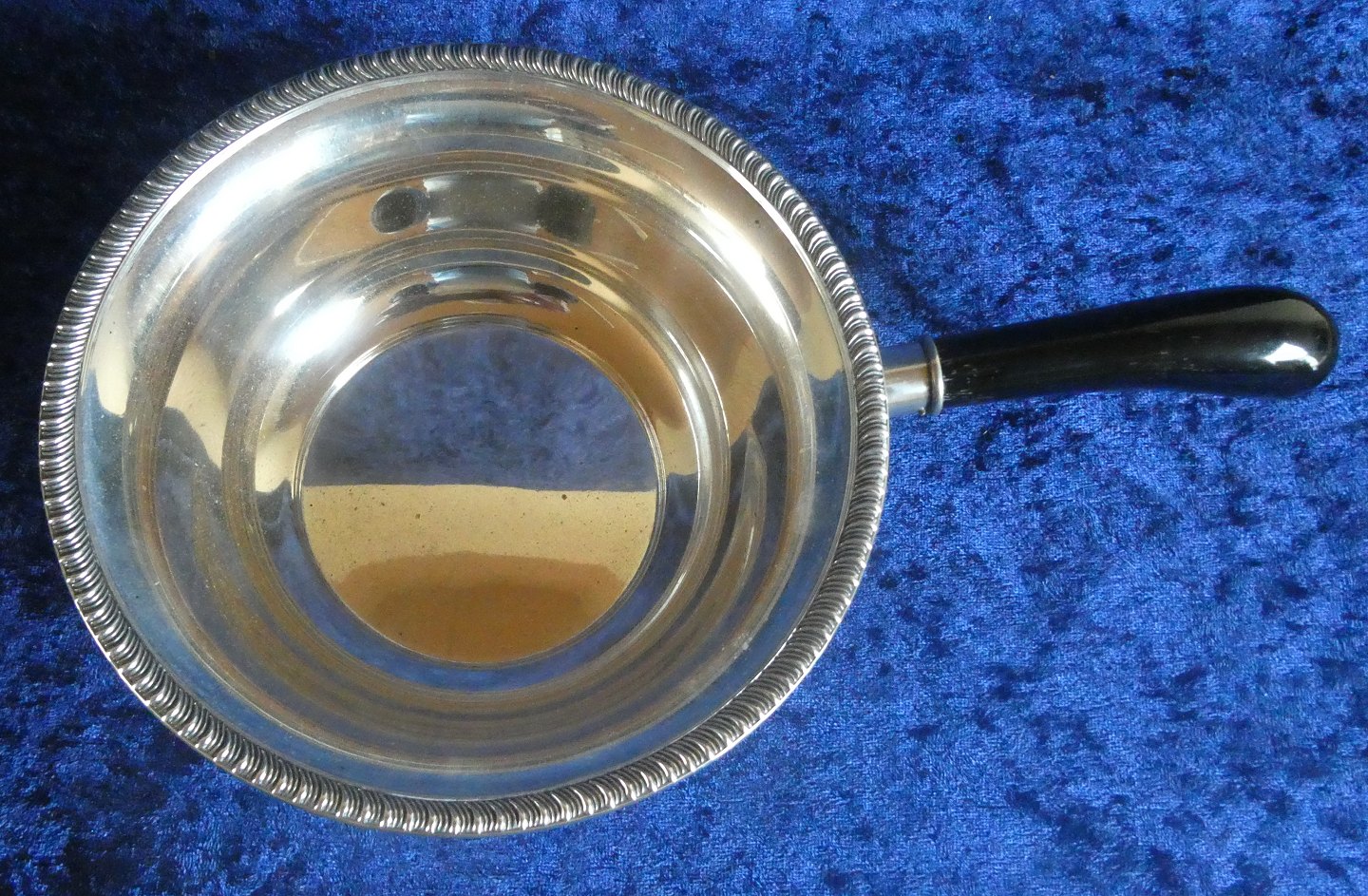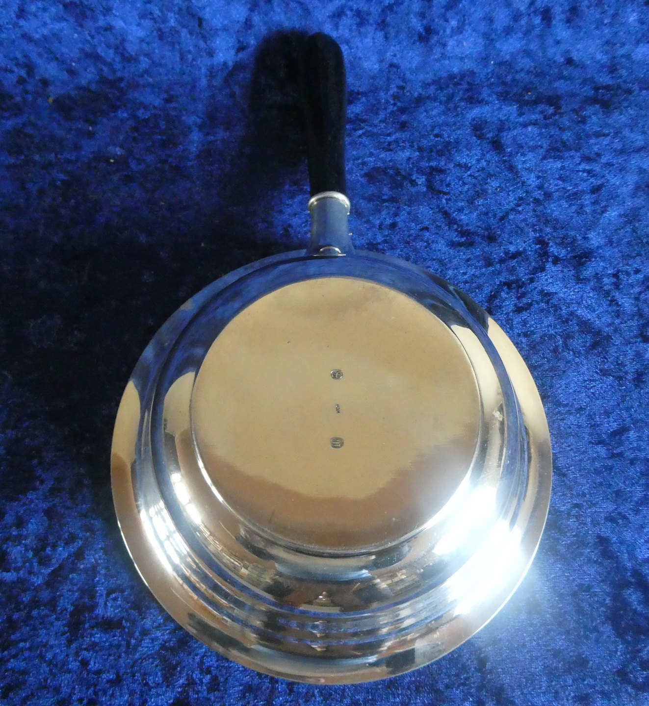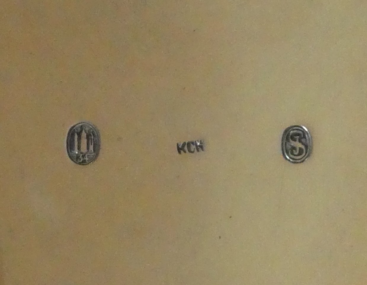 K.C. Hermann sølvkorpus, sølvarbejde i 3-tårnet sølv.Kasserolle eller stor skål i tretårnet sølv med sort træhank fra 1934, pæn og velholdt. Fremstillet af sølvsmed K.C. Hermann, København. Københavner stempel med årstal 34, KCH for K.C. Hermann og guardein "JS" for Jens Sigsgaard (1932-1960).