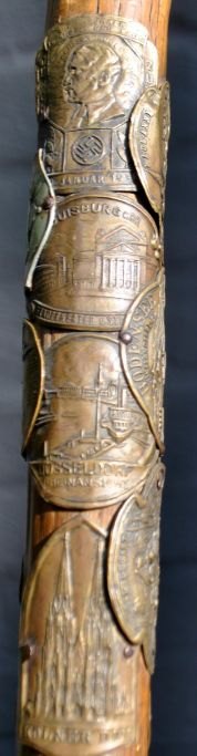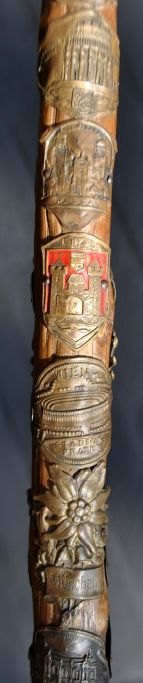 Udsædvanlig vandrer stok ca. 1933. Tyskland/Danmark. Med talrige skilte fra tyske, schweiziske og østrigske byer. L.: 90 cm.Proveniens: Dansk mand, der har været på valsen.