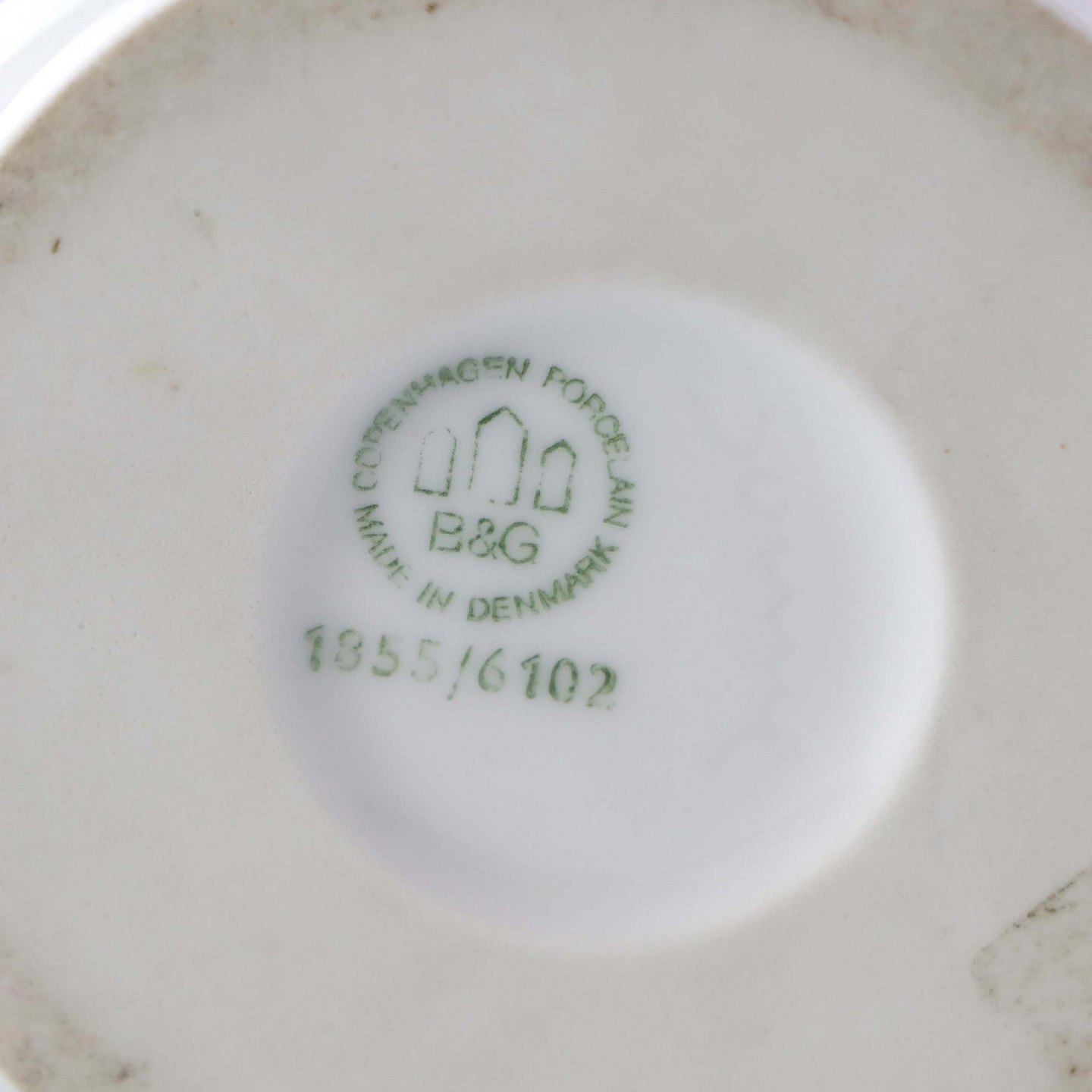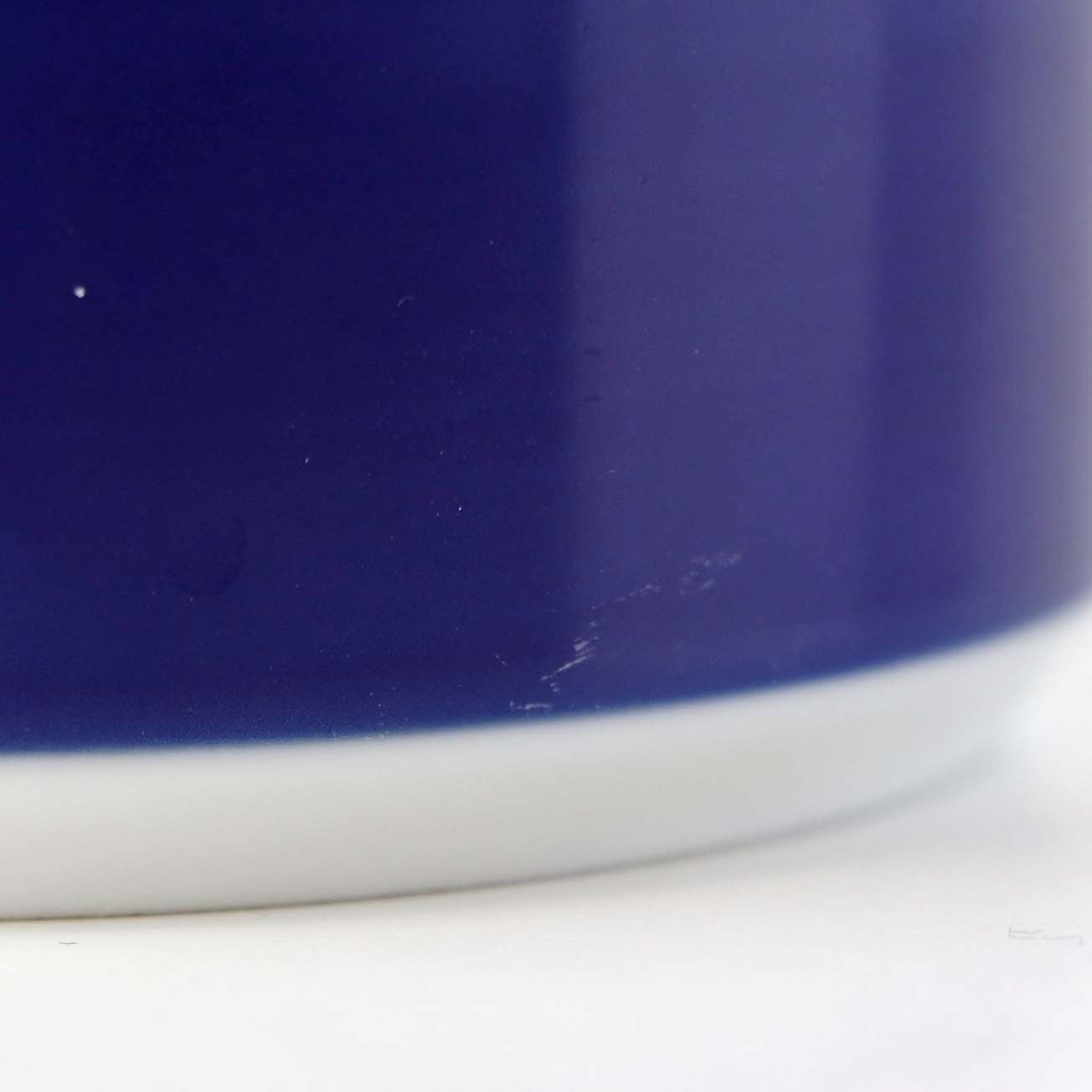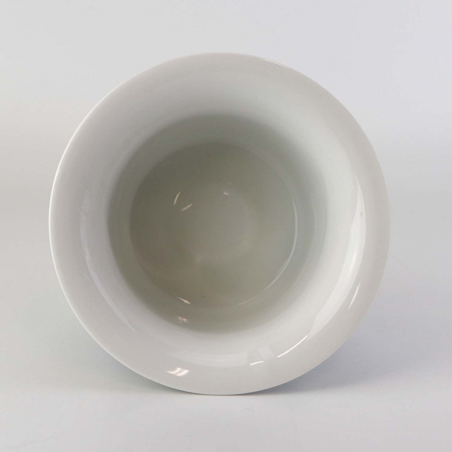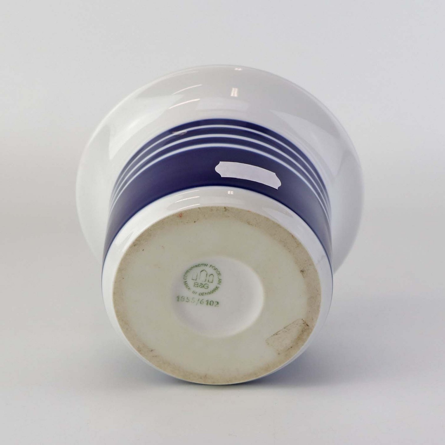 Lille urtepotteskjuler i glat hvidt porcelæn dekoreret med blå striber. Nr. 1855/6102Formgiver Edith Sonne