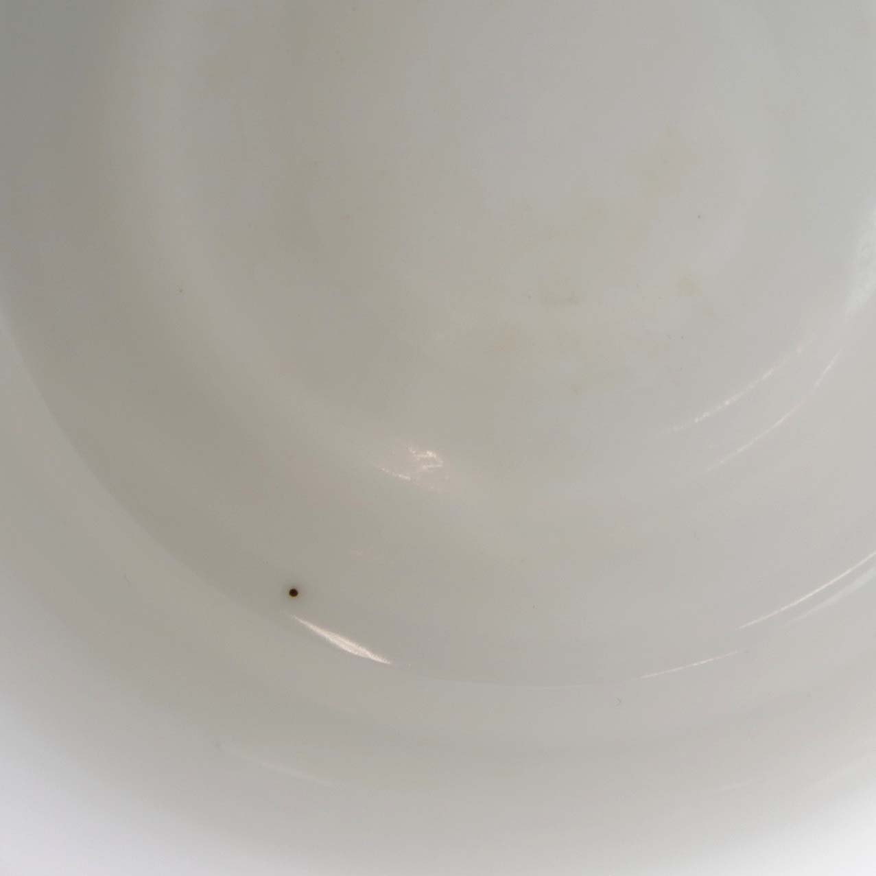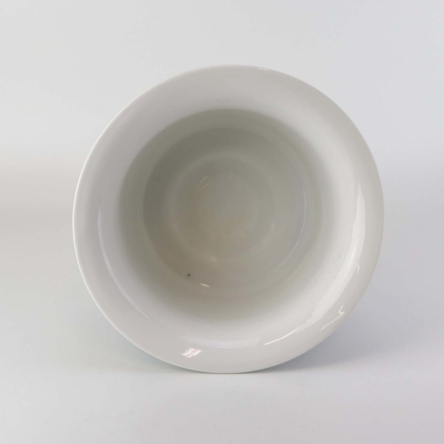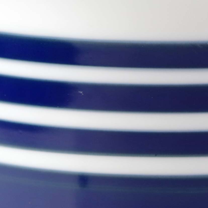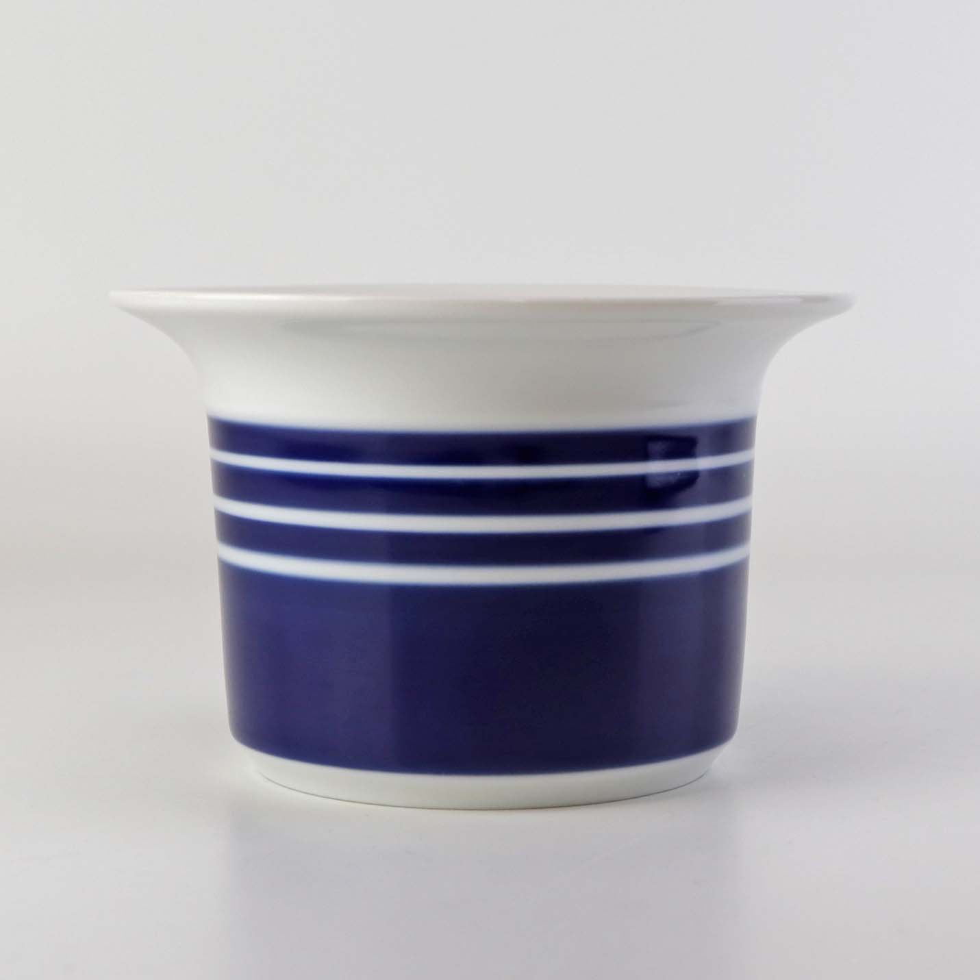 Urtepotteskjuler i glat hvidt porcelæn dekoreret med blå striber. Nr. 1855/6104Formgiver Edith Sonne