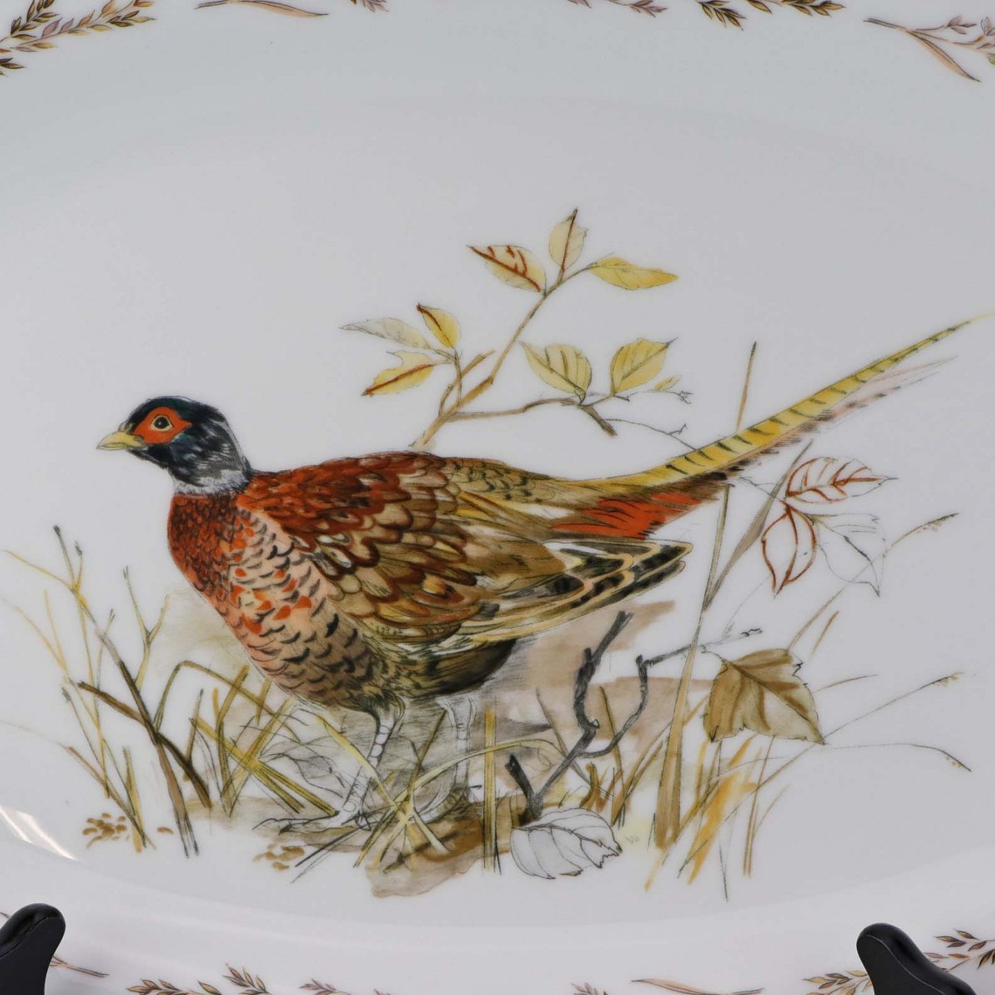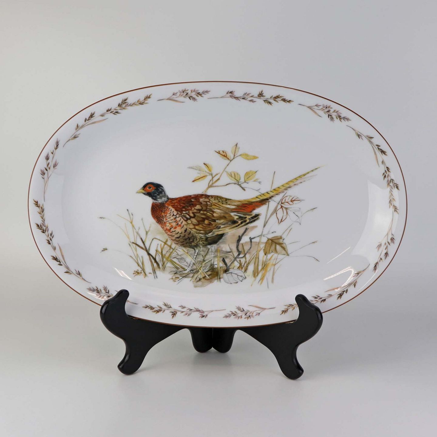 Ovalt serveringsfad i porcelæn med motiv af fasan fra stellet Jagtstel. Nr. 35Formgiver Mads Stage