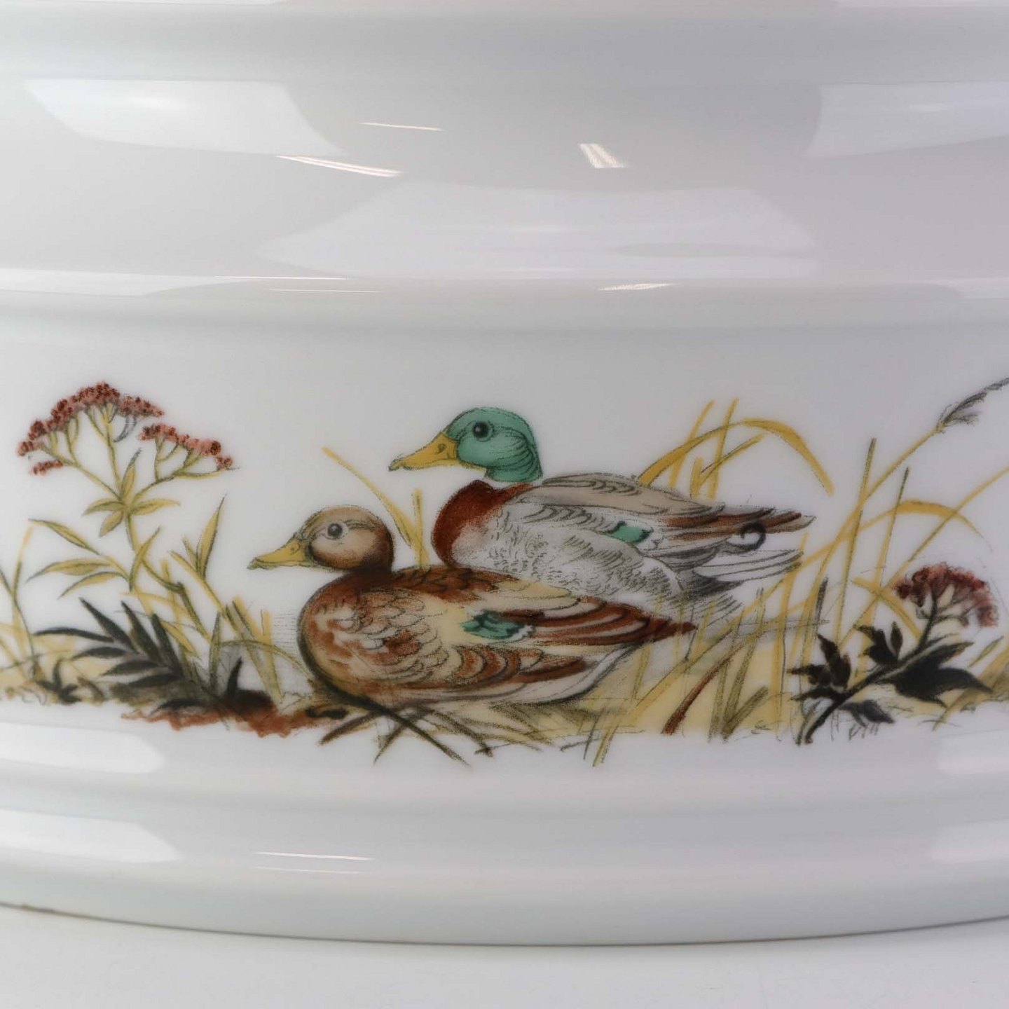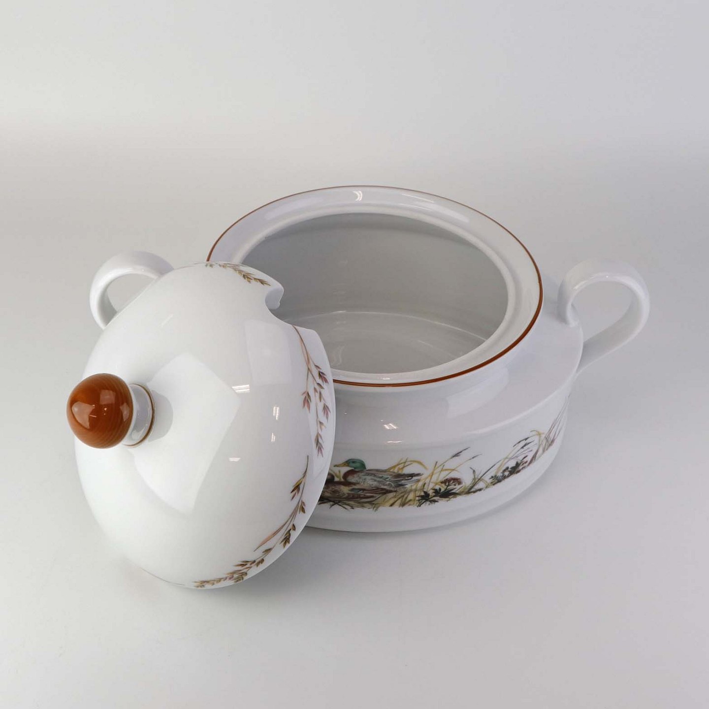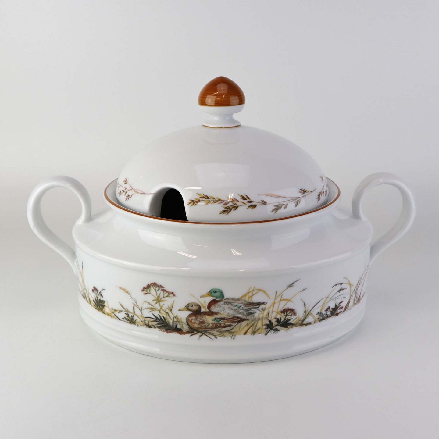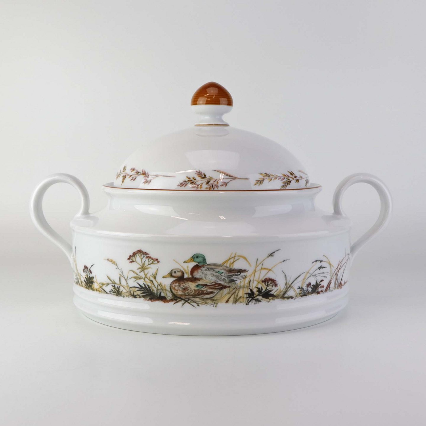 Ragout fad i porcelæn med låg og hanke, som er dekoreret med motiv af ænder fra stellet Jagtstel.Formgiver Mads Stage