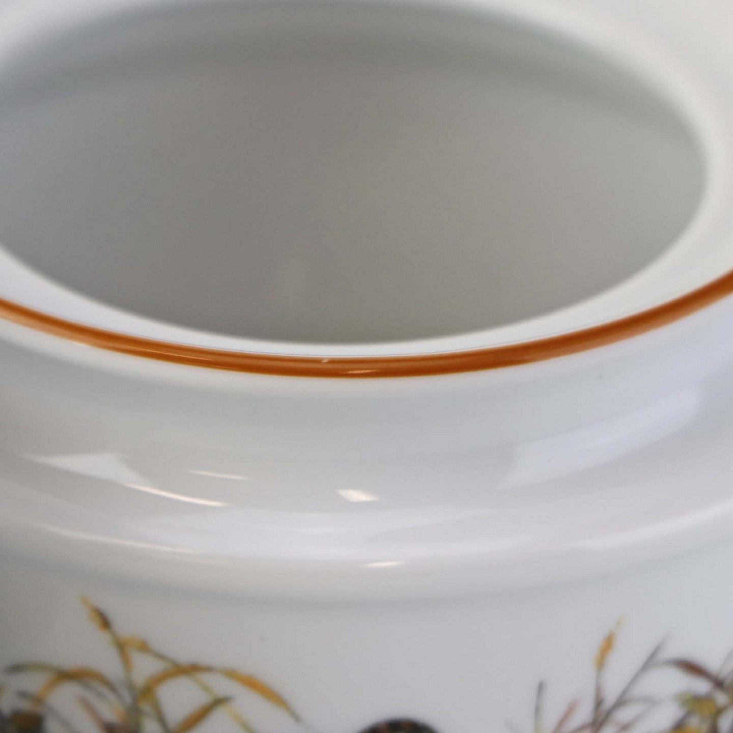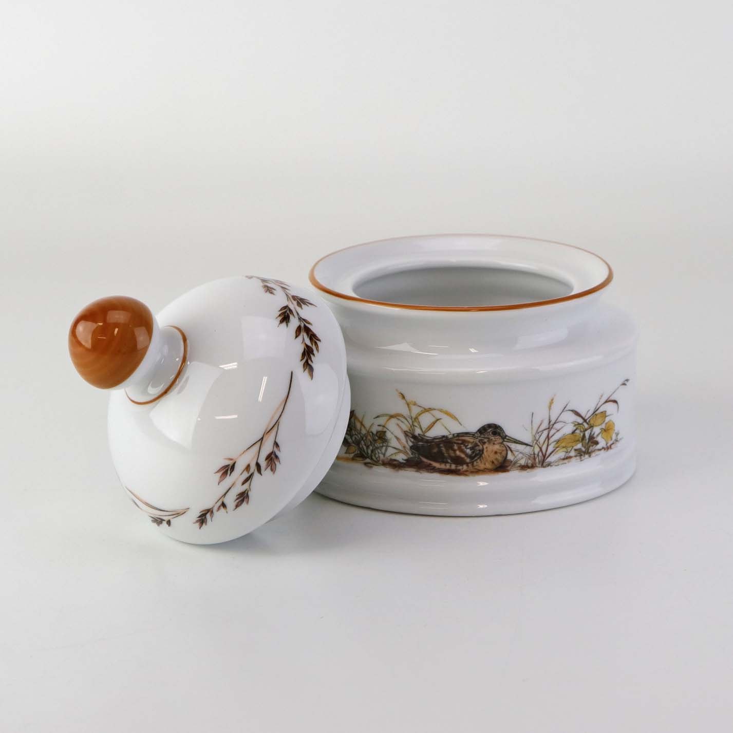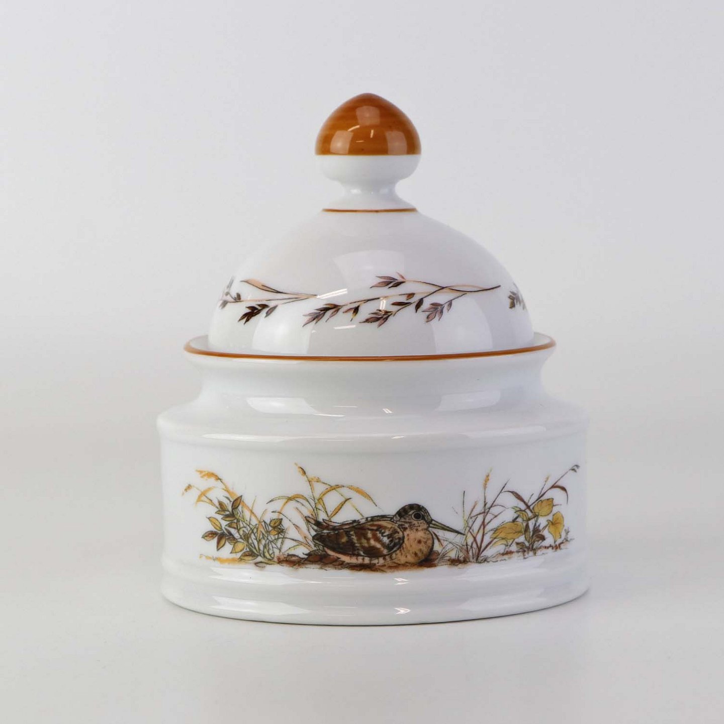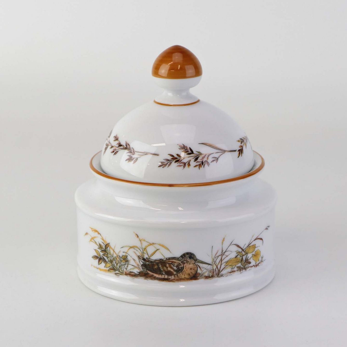 Lågkrukke til sukker i porcelæn med motiv af en sneppe fra stellet Jagtstel.Formgiver Mads Stage