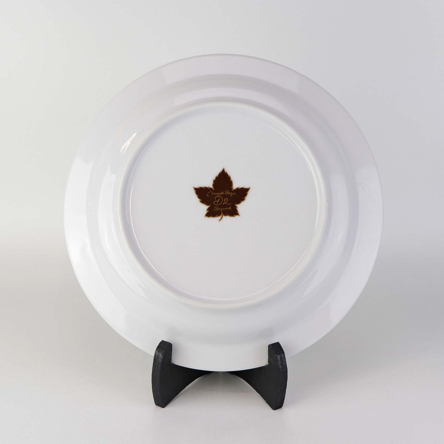 Jagtstellet er i glat hvidt porcelæn med gyldenbrun kantdekoration og motiver af forskellige vilde danske dyr i deres naturlige miljø. Stellet er holdt i dæmpede varme efterårsfarver.