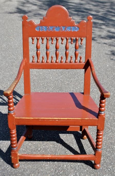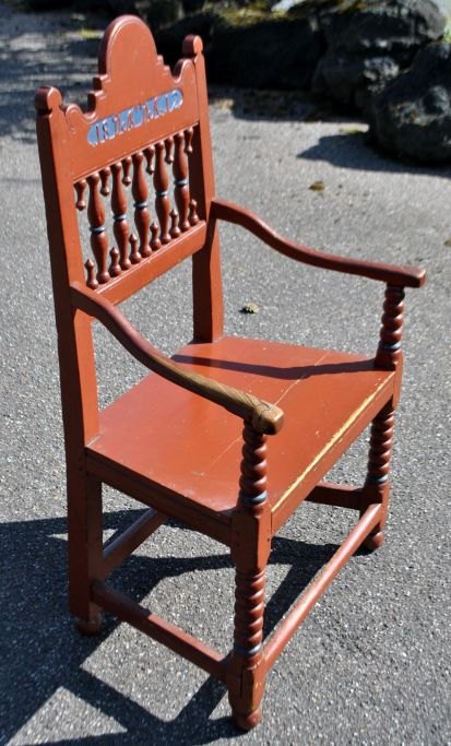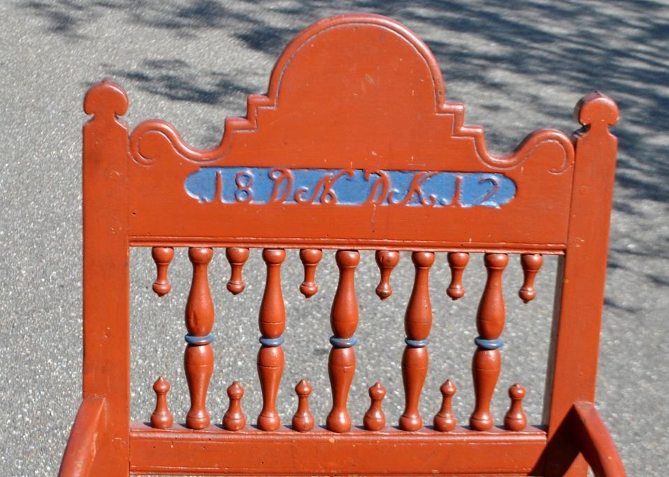 Armstol af bemalet bøgetræ 1812. Danmark. Rødmalet. 5 delt tremmeryg. Ryggen skåret med karvsnit og initialerne: DN DK 1812. H.: 106 cm. B.: 67 cm. D.: 39,5 cm.Virkelig flot stand!