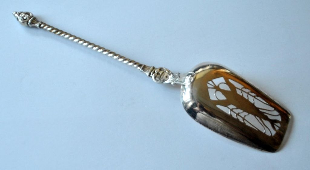 Silver crab spoon, Copenhagen, 1869. Unidentifiable master's mark. With city coat of arms and guardein mark. Handle with crab and interior gilding. Twisted handle with angel head. L: 22 cm.Item number: 28110