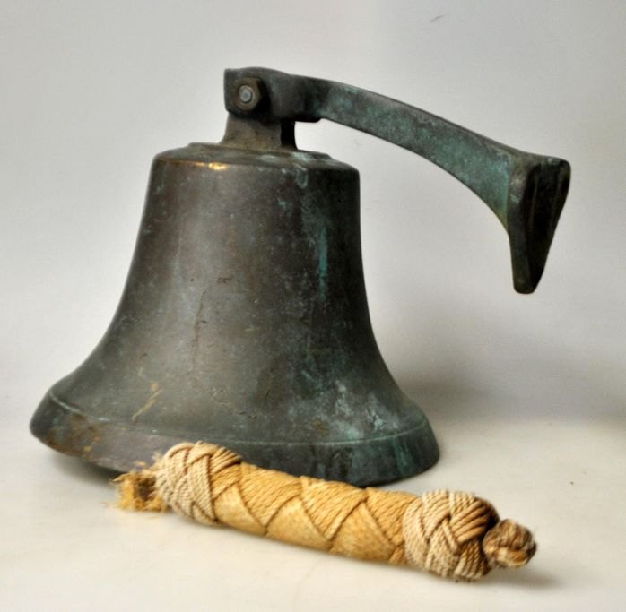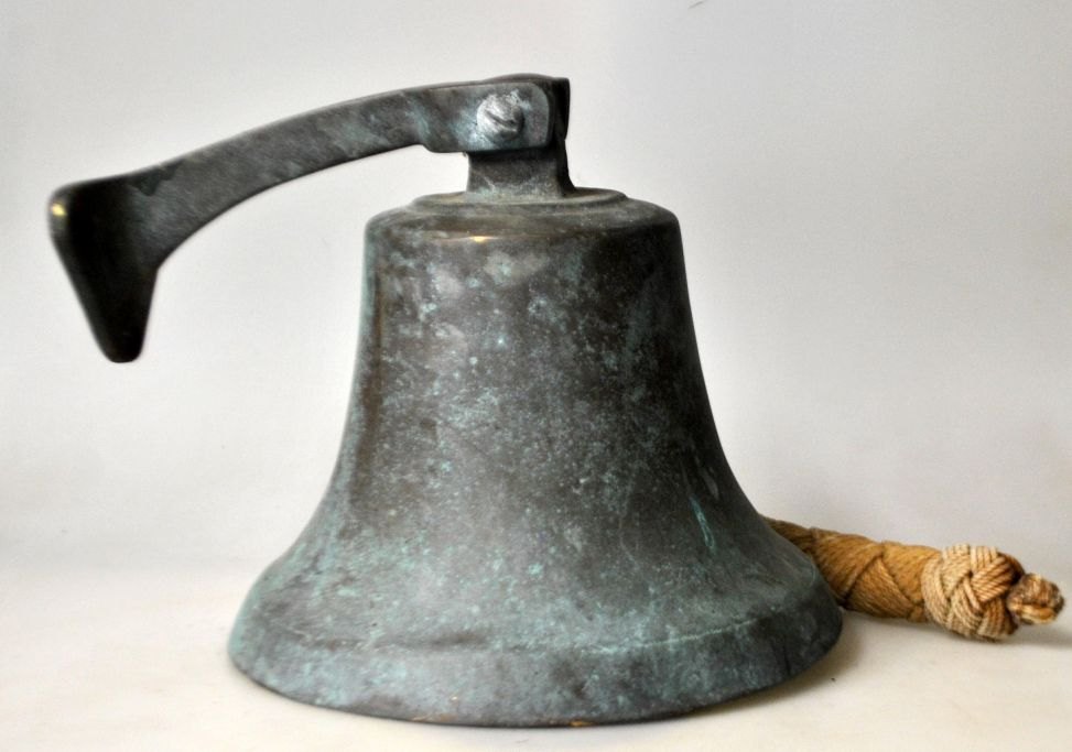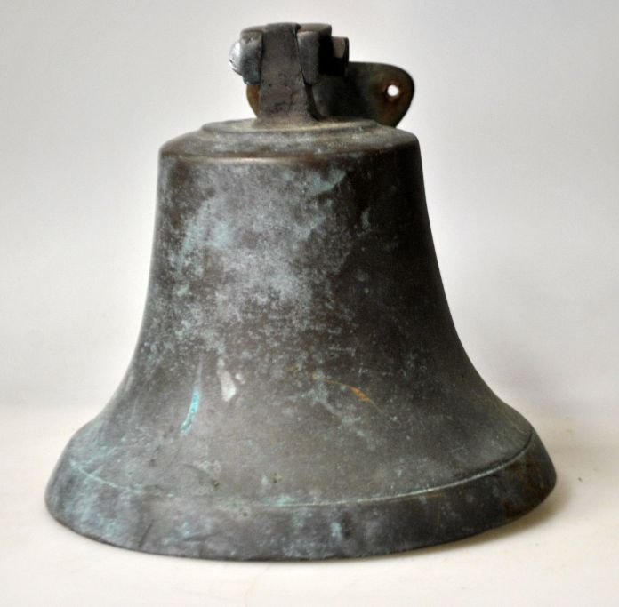 En gammel gårdklokke, malm, 20. årh. Danmark. Med hængearm. H.: 19 cm. Dia.: 19 cm.Emne nummer: 28197