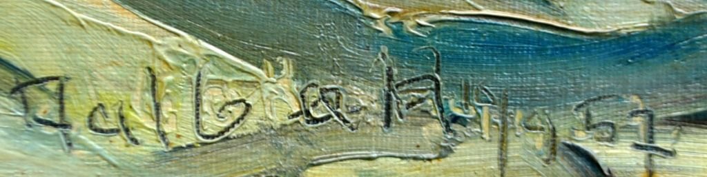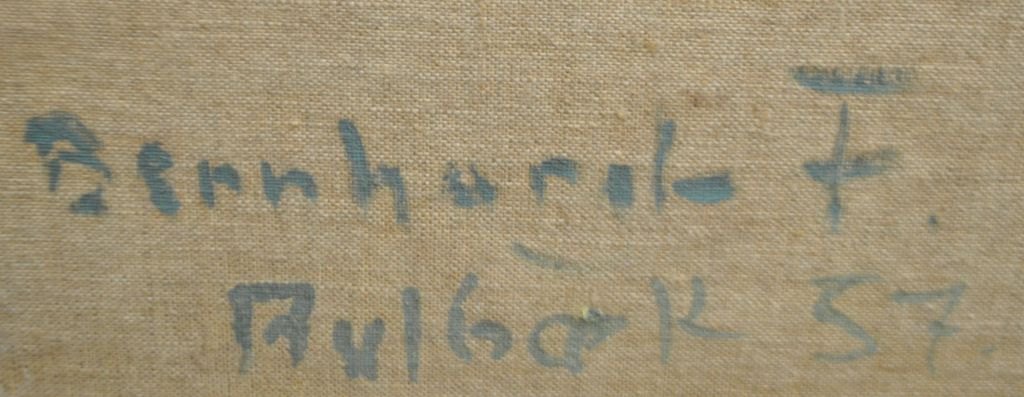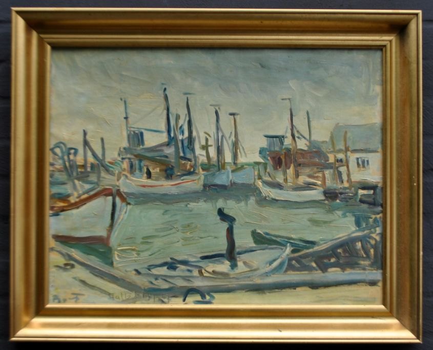 Bernhardt-Frederiksen, Aage (1883 - 1963) Danmark: Havnen i Aalbæk. Olie på lærred. Signeret den 19.9.1957. 44 x 60 cm.Verso signeret.