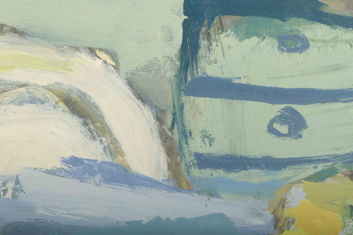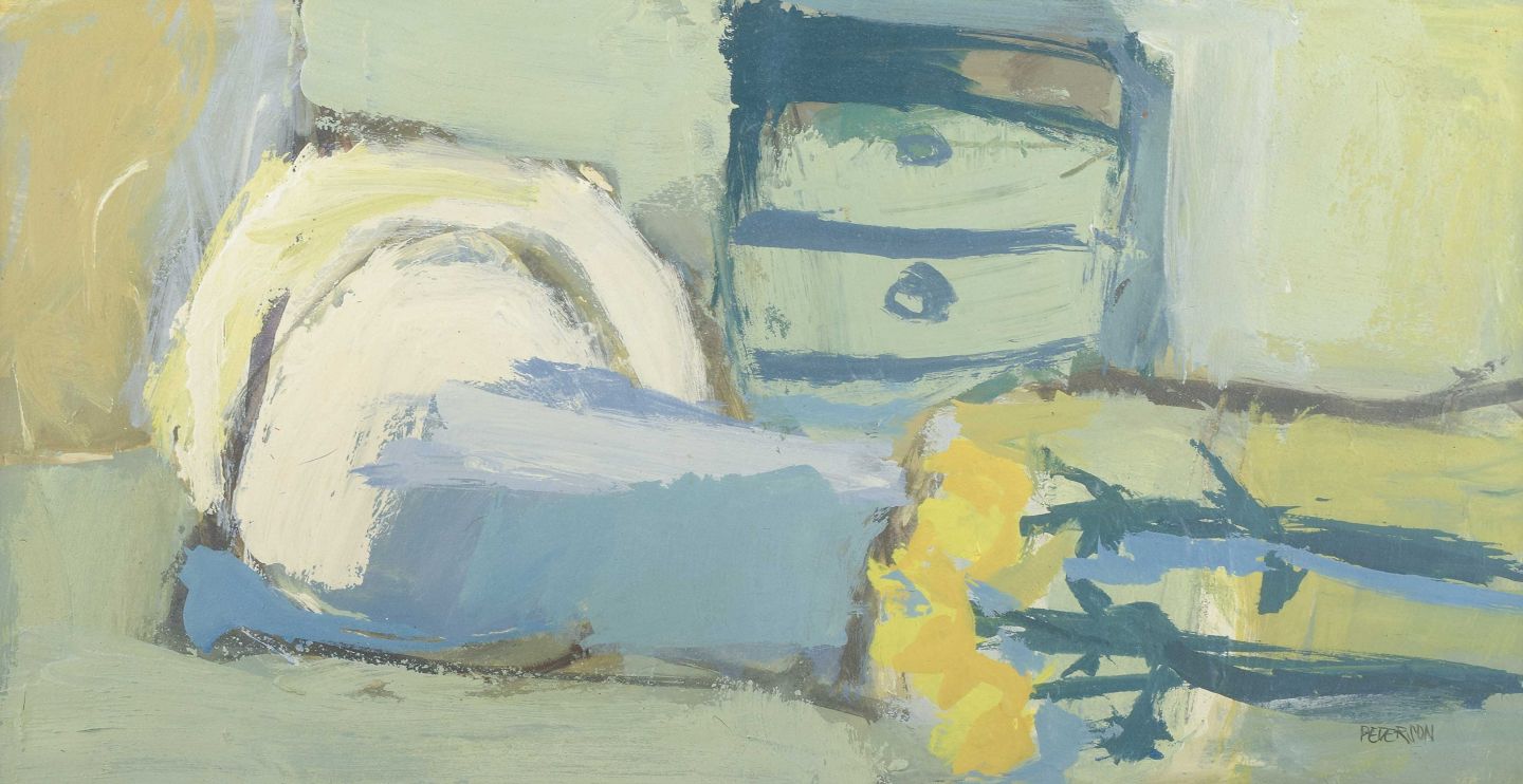 Et stemningsfuldt abstrakt stilleben, hvor geometriske og bløde former i blå, grønne og gule nuancer skaber en harmonisk og lyrisk komposition. Motivet antyder et interiør med blomster og genstande, fortolket i en løs og ekspressiv penselføring typisk for perioden.