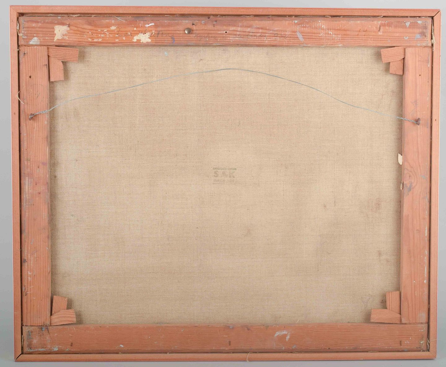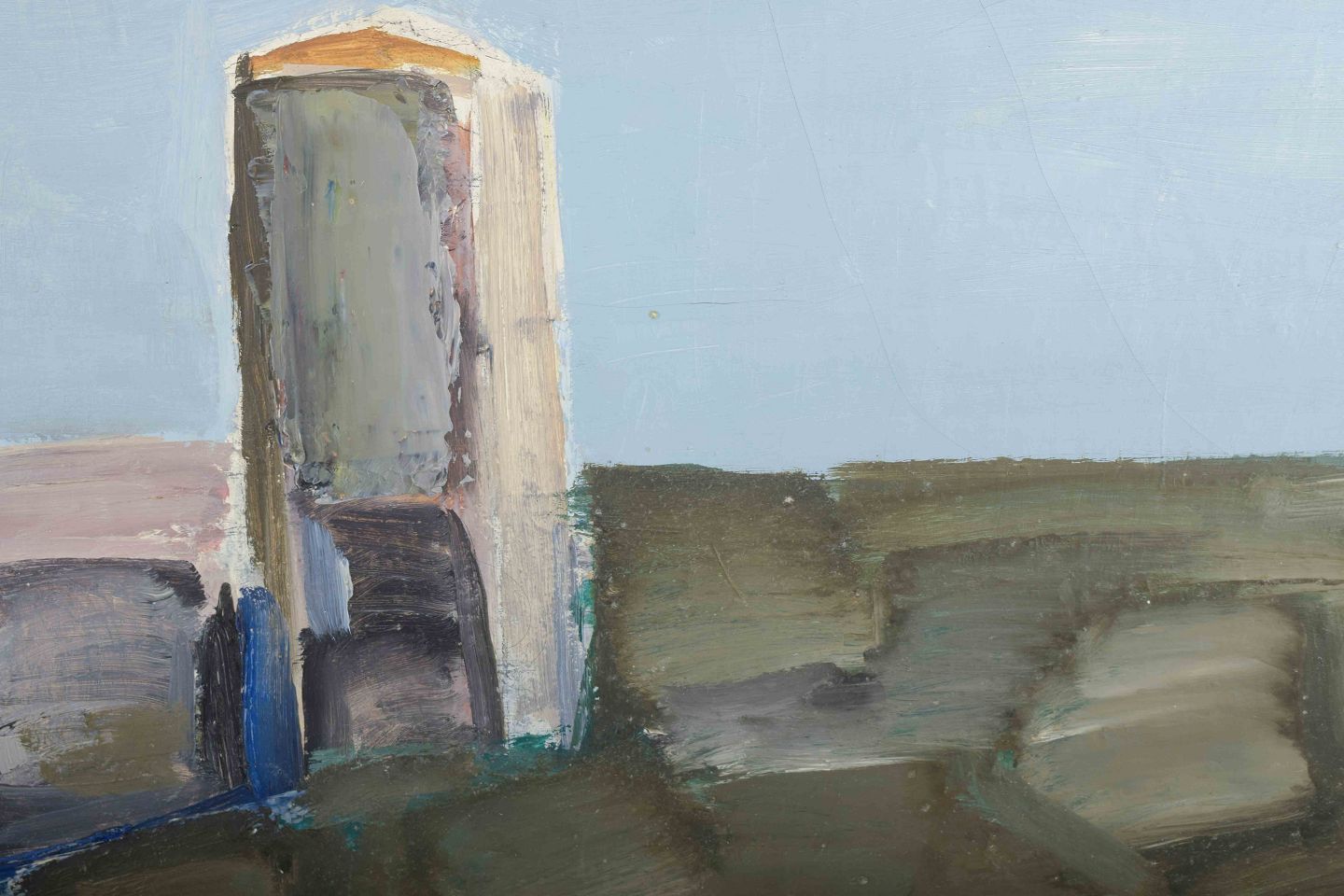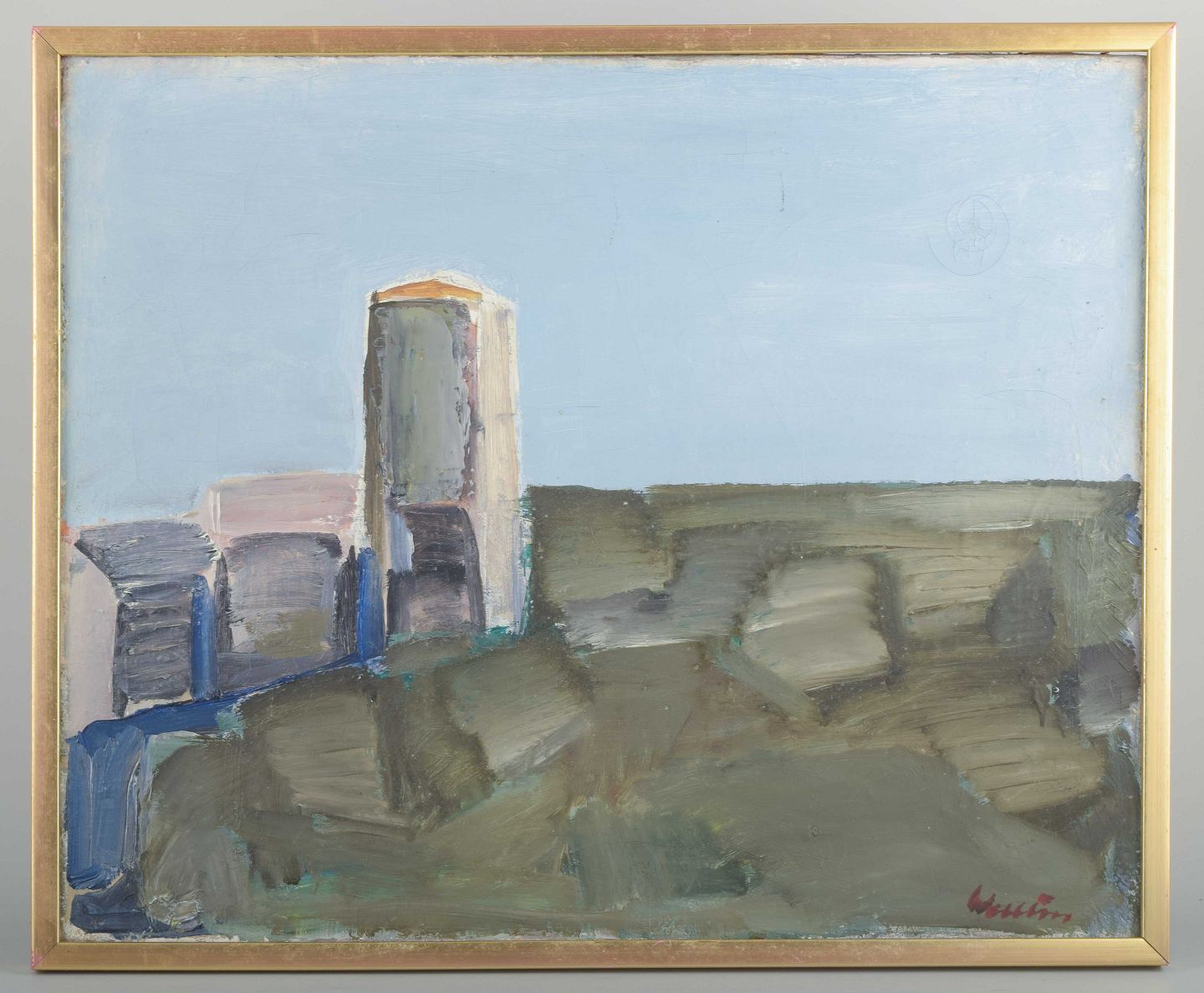Et modernistisk landskabsmaleri med geometrisk-abstrakte former og en monumental bygning centralt i kompositionen. De brede penselstrøg og afdæmpede farver understøtter værkets stoflige og arkitektoniske udtryk.