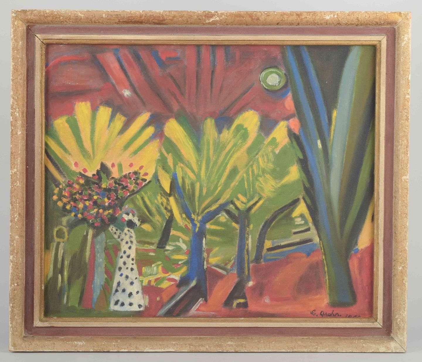C. Grahn, svensk kunstner.Abstrakt komposition med træer og figur.