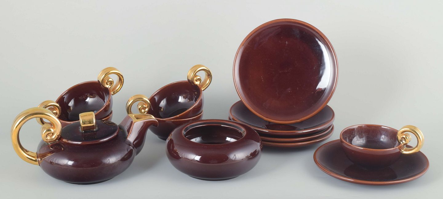 Teservice i glaseret keramik med dyb bordeaux farve og karakteristiske håndtag i forgyldt keramik. Bestående af tekande, sukkerskål, fem kopper med underkopper samt fem tallerkener.