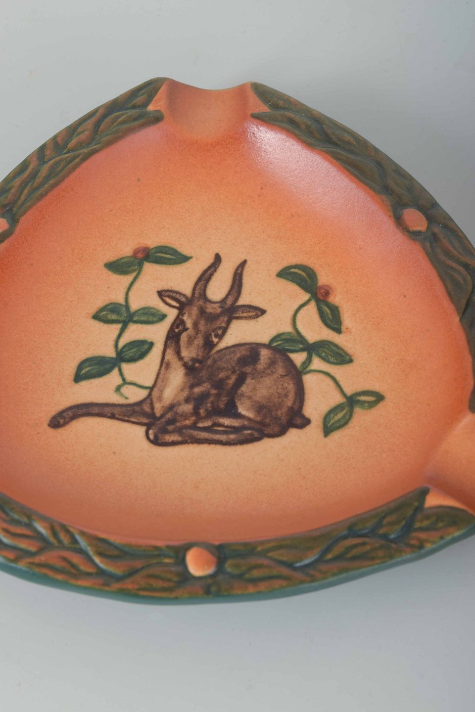 Et sæt bestående af tre dele udført i stentøj med flerfarvet begitning og glasur i orange, grønne og brune nuancer. Omfatter: askebæger med naturmotiv, lille vase på tre ben samt pibeholder med organiske former.
