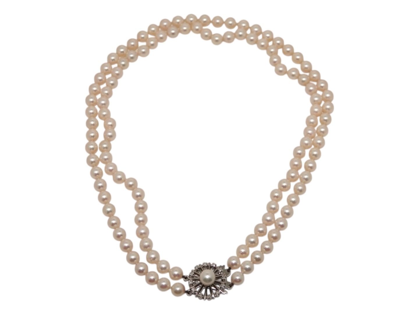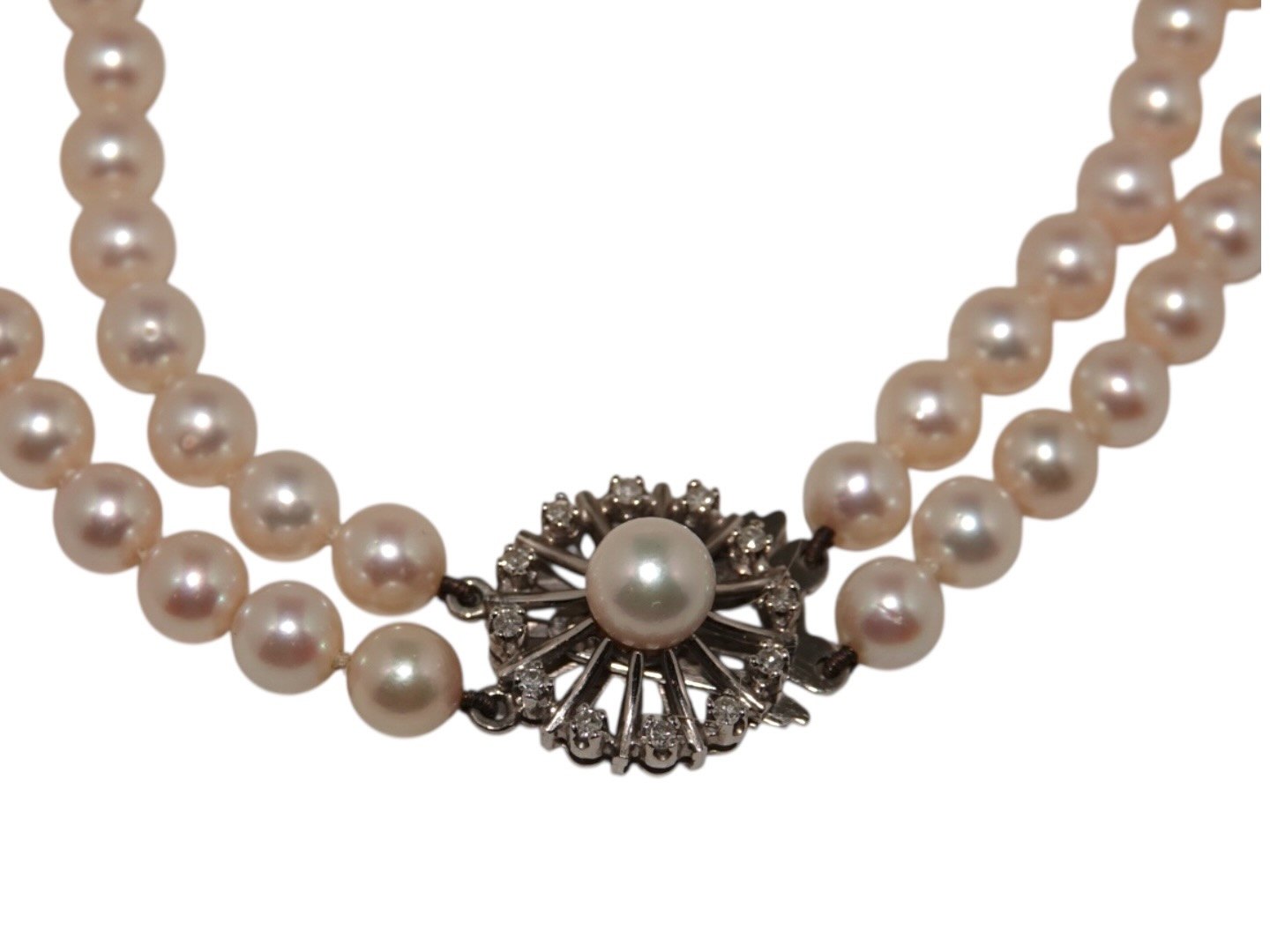 Dobbeltradet perlekæde af store rosa-farvet Akoya perler fra Japan. Akoya perler er regnet af nogle af de bedste perler blandt andet på grund af en general højere kvalitet, en rundere form og en flot skinnende overflade.Disse perler måler 7 mm. i diameter, hvilket er stort for Akoja perler og farven rosa er den mest eftertragtede.