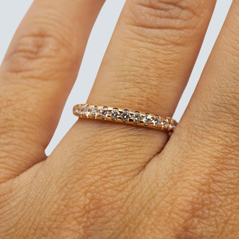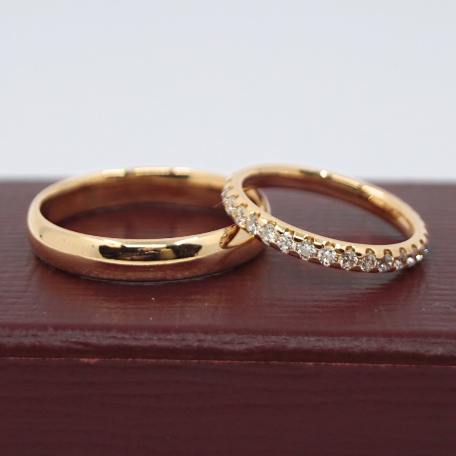 Sæt vielsesringe i 18 kt. guld. Den ene med blank overflade, i ring str. 61 (størrelse kan evt. omforandres). Den anden prydet med diamanter, i alt 0.70ct. TW Si. I ring str. 50.Begge stemplet "Becher Au 750".