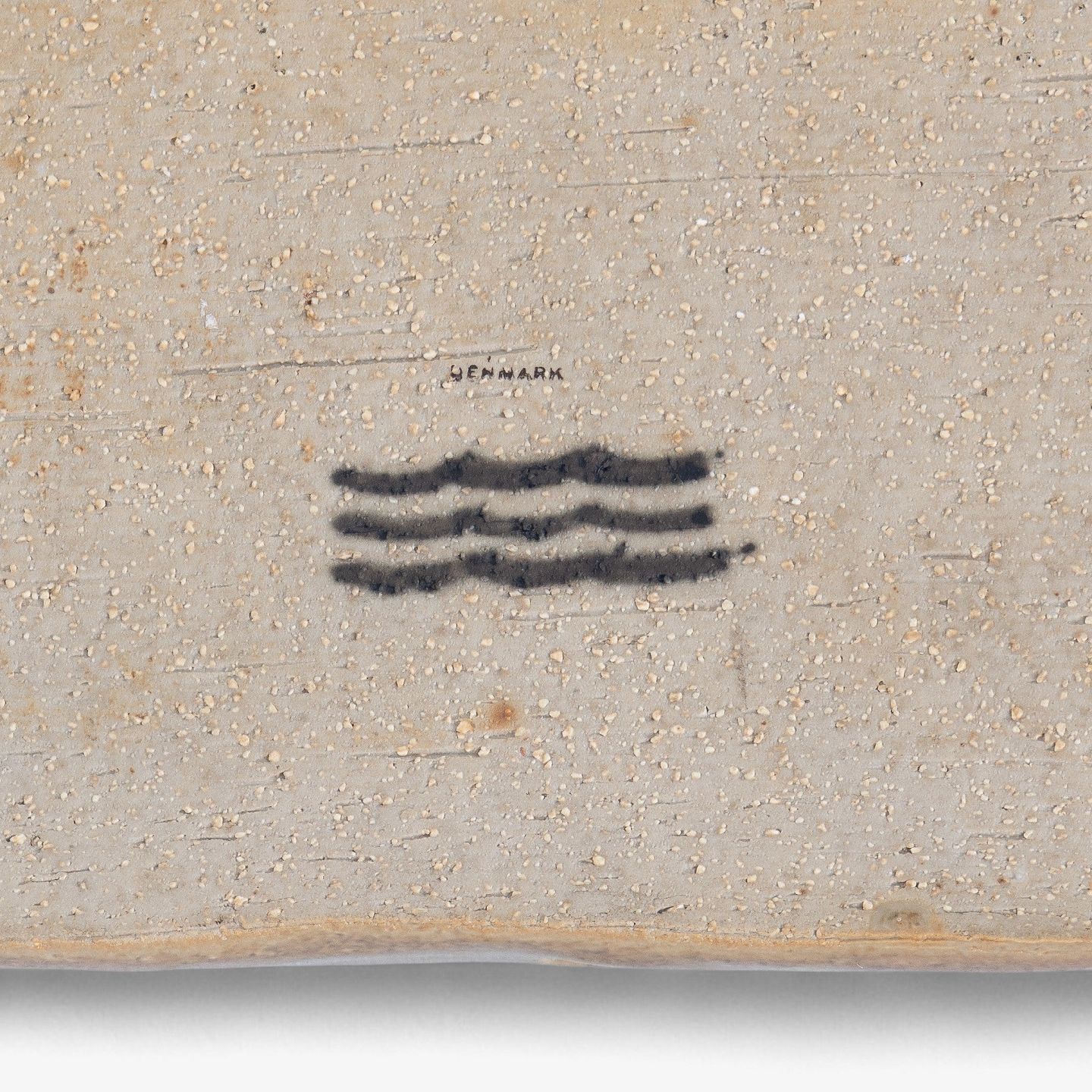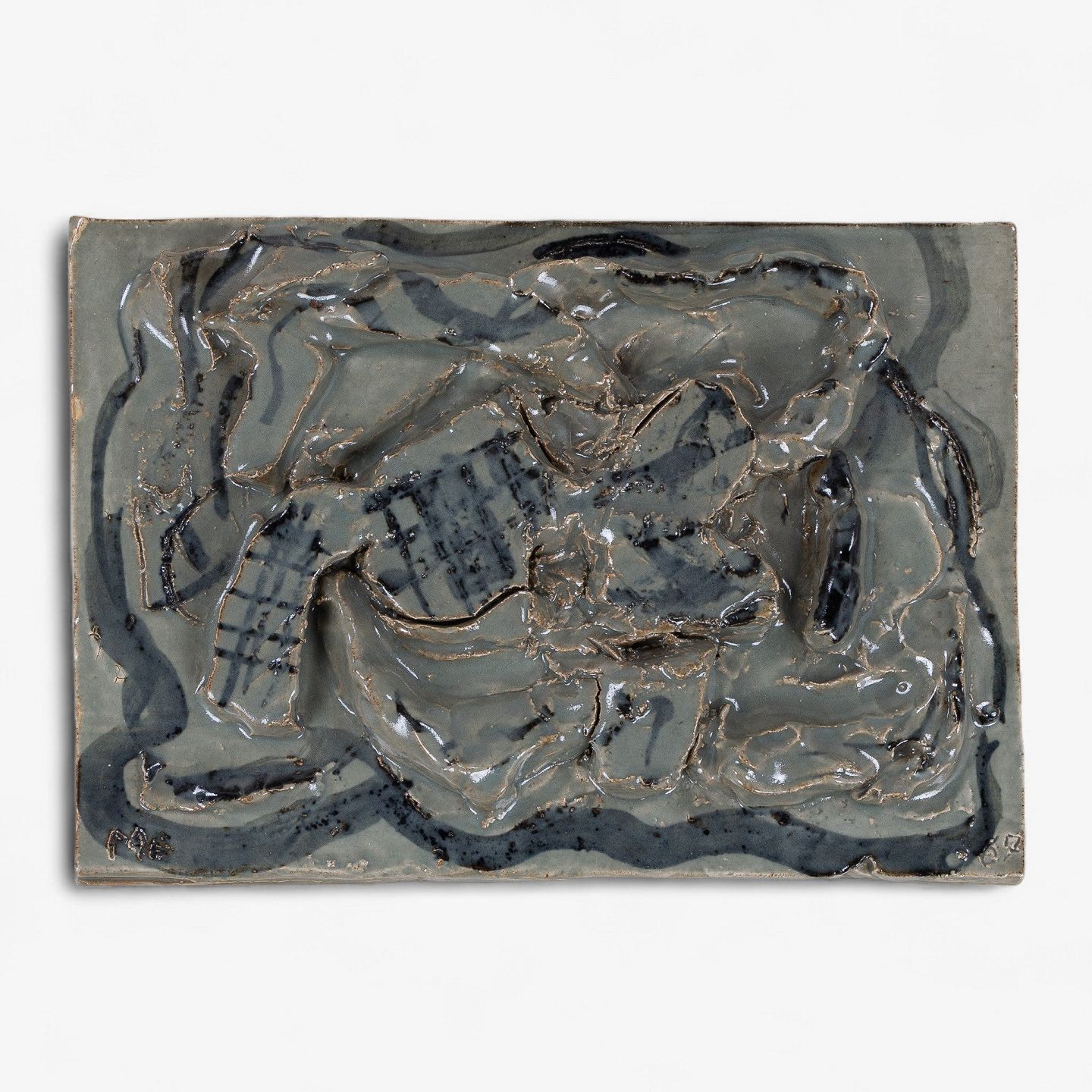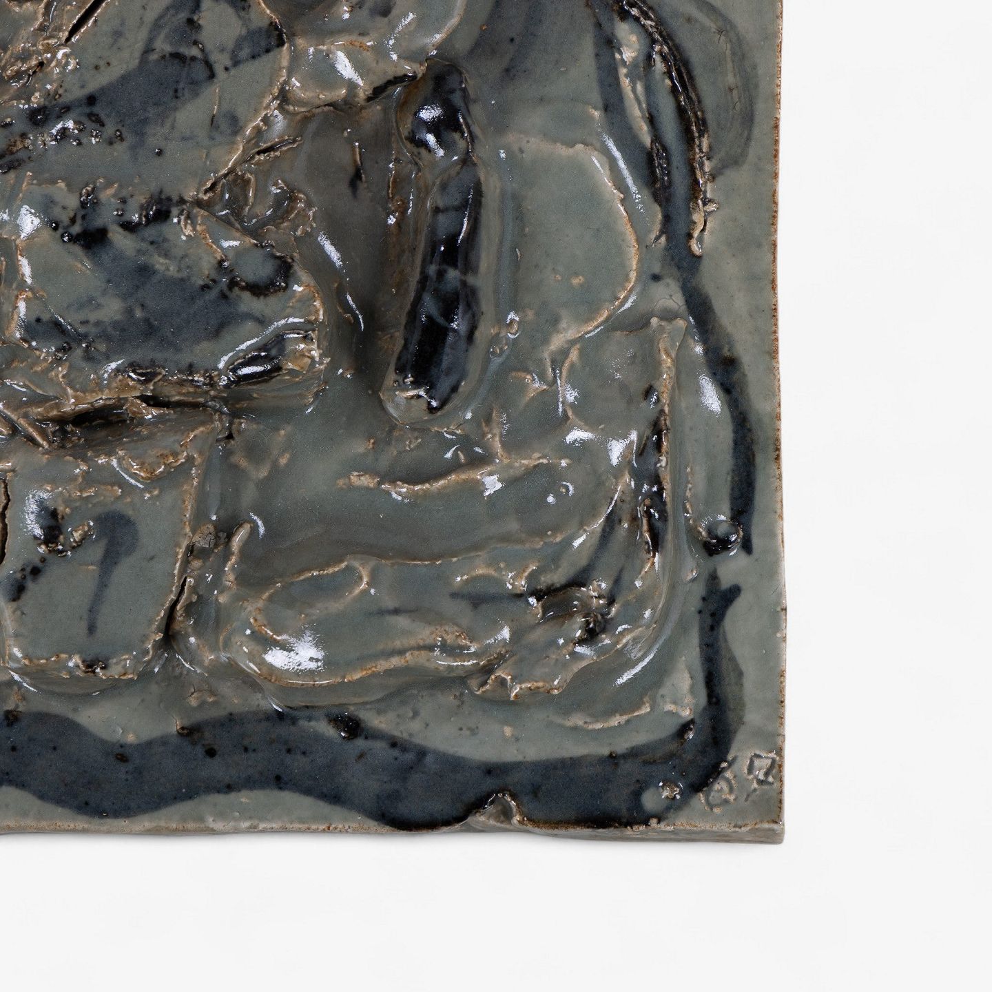 Relief i stentøj med abstrakte former og grønlig glasur. Signeret, MA 67. Stemplet fra producent.