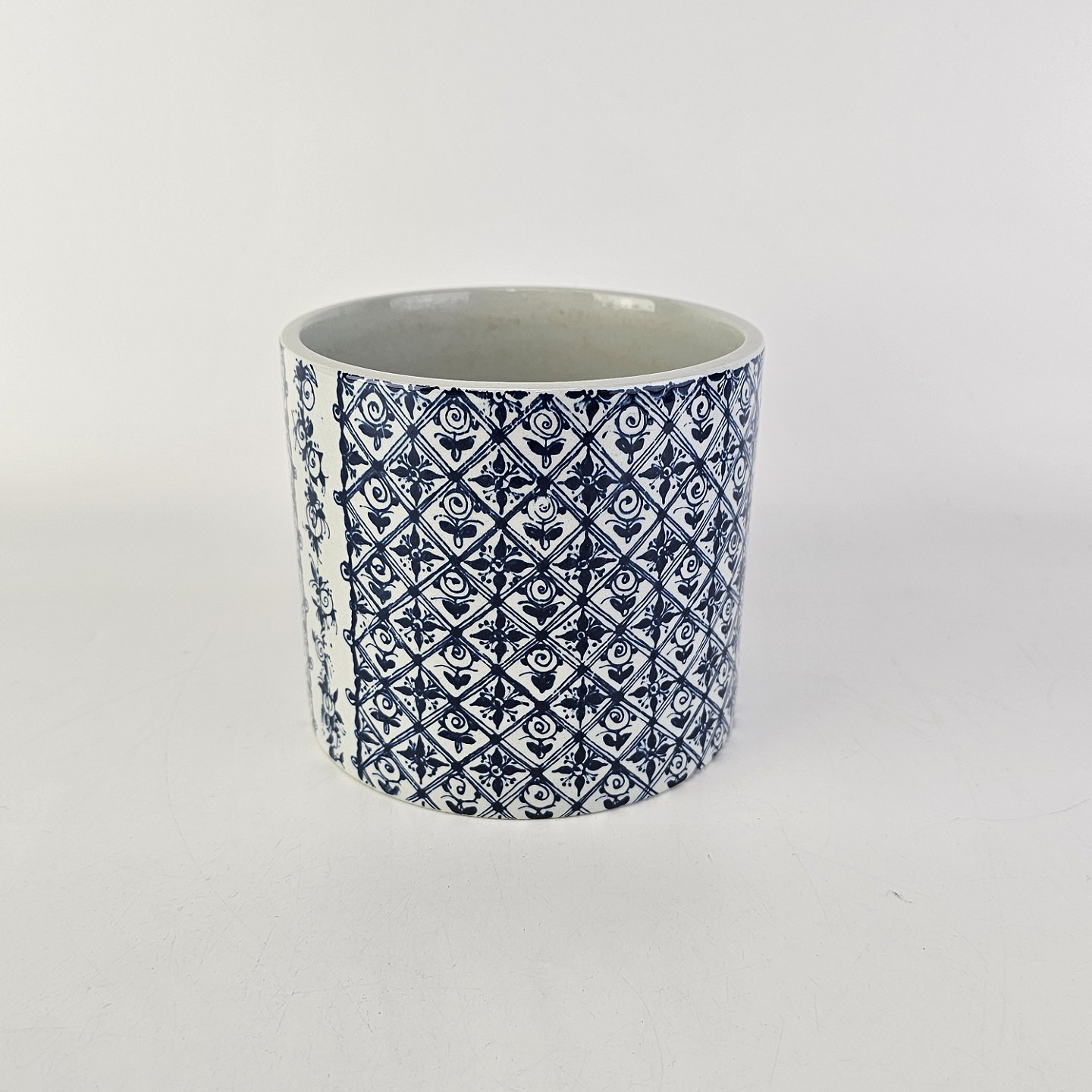 Urtepotteskjuler af keramik med et sort/hvidt mønster af en kvinde og blomster og teksten KolerikerNo 3023-698