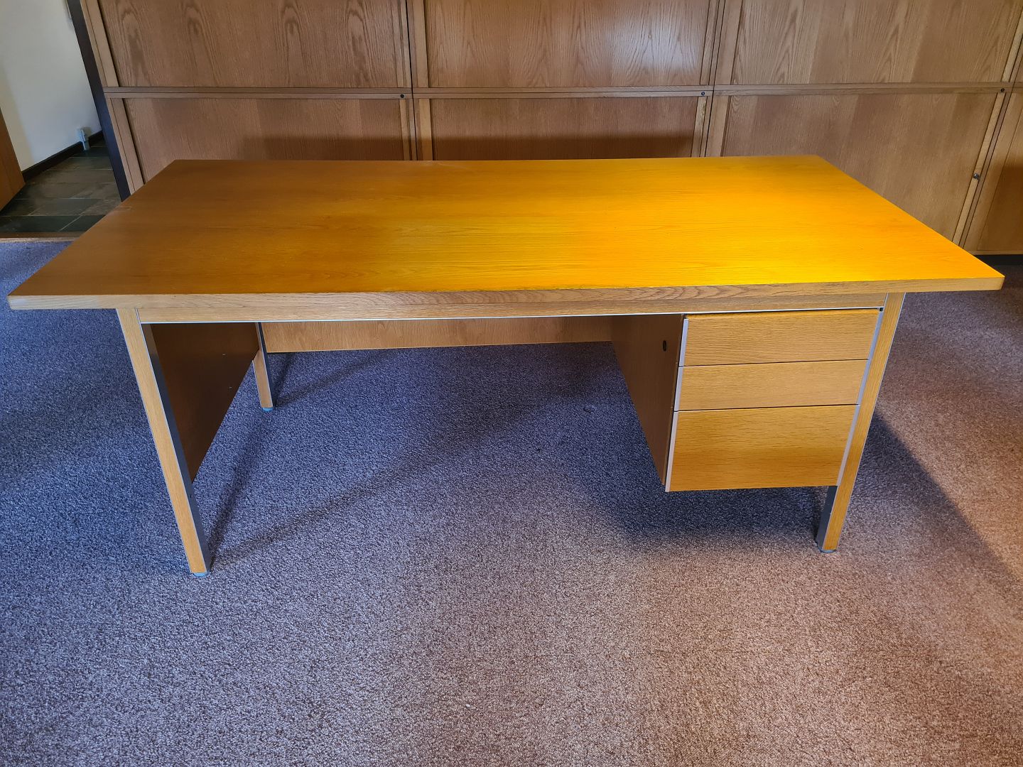 Stort Skrivebord fra 1980'erne i eg og aluminium. Fremstår pænt, velholdt og udmærket funktionsdygtigt. Dog med meget let afblegning på bordpladen efter en skrivemåtte. (Ses på billede)Højde 74 cm. Bredde 120 cm. Dybde 45 cm.
