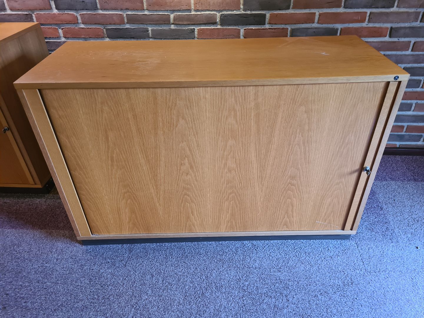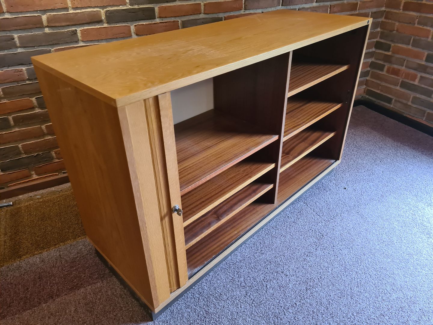Arkivskab fra 1980'erne i finéret eg med jalousi låge. Fremstår pænt og velholdt, dog med lettere brugsspor på toppen. (Billeder) Forskellige indretningsformer haves. Fungerende nøgle medfølger.Højde 74 cm. Bredde 120 cm. Dybde 45 cm.