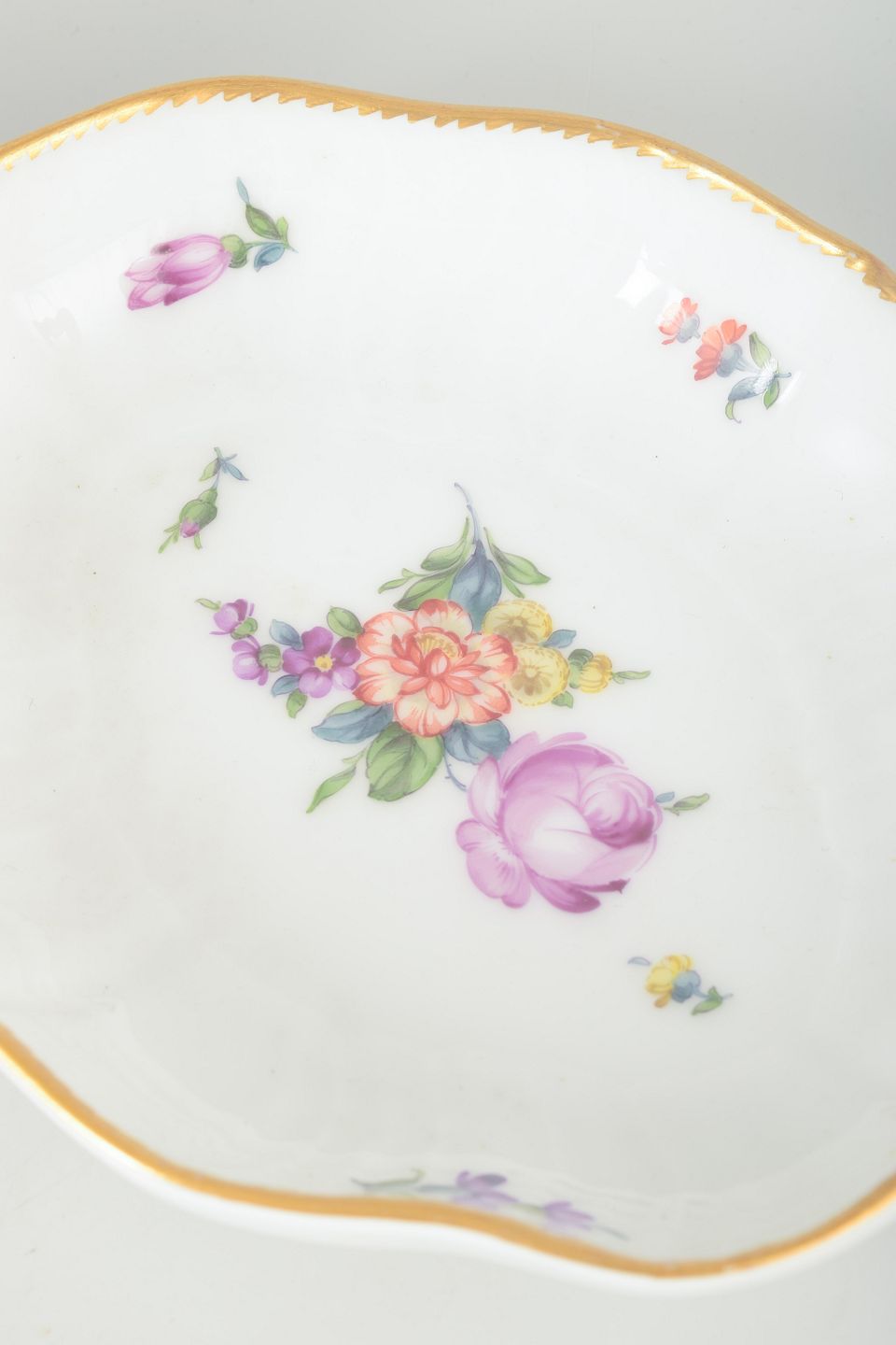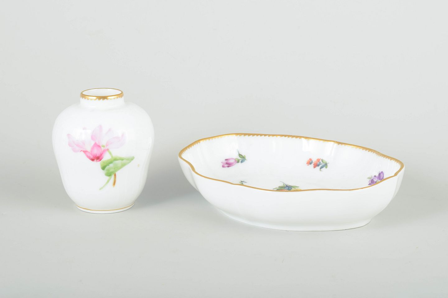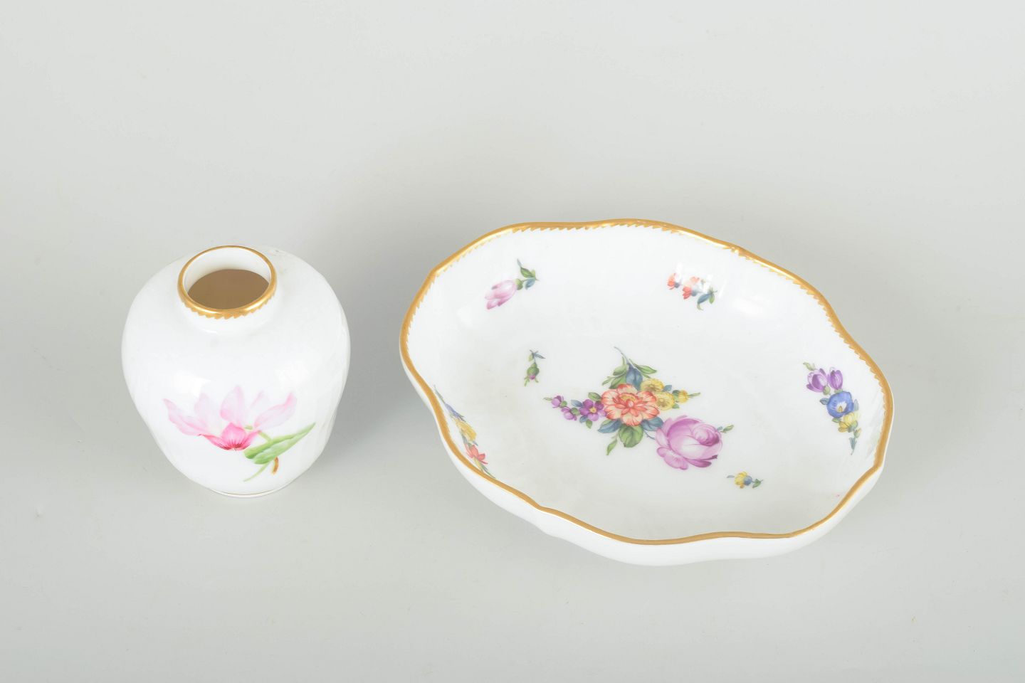Porcelain set consisting of a small baluster-shaped vase with hand-painted floral decoration and gilt rim, together with an oval cake plate decorated in the classic “Saxon Flower” pattern.