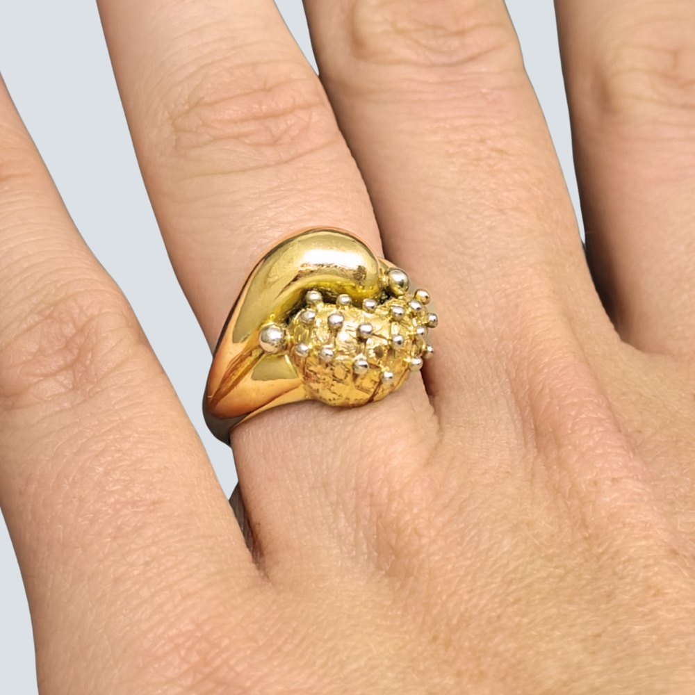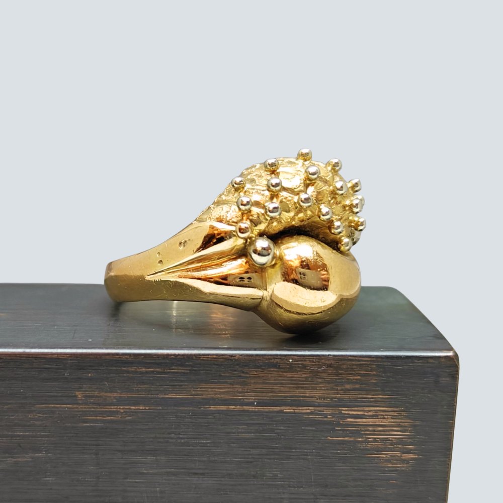 Ring i 18 kt. guld prydet med mønster foran. Ring str. 55.Bredde: 0,4 - 1,6 cm.