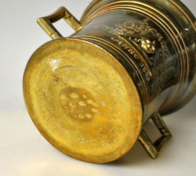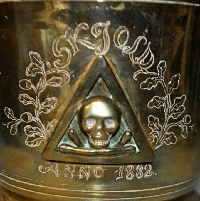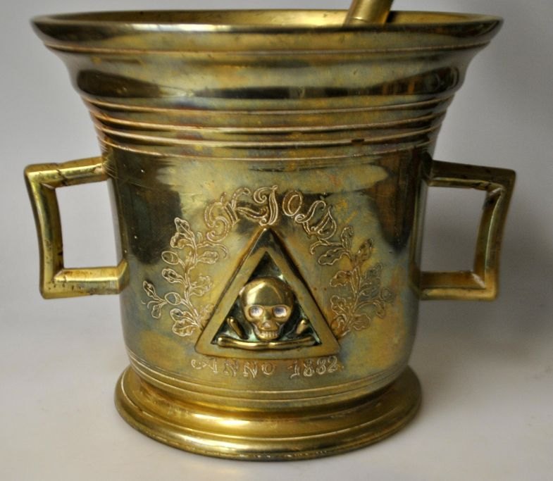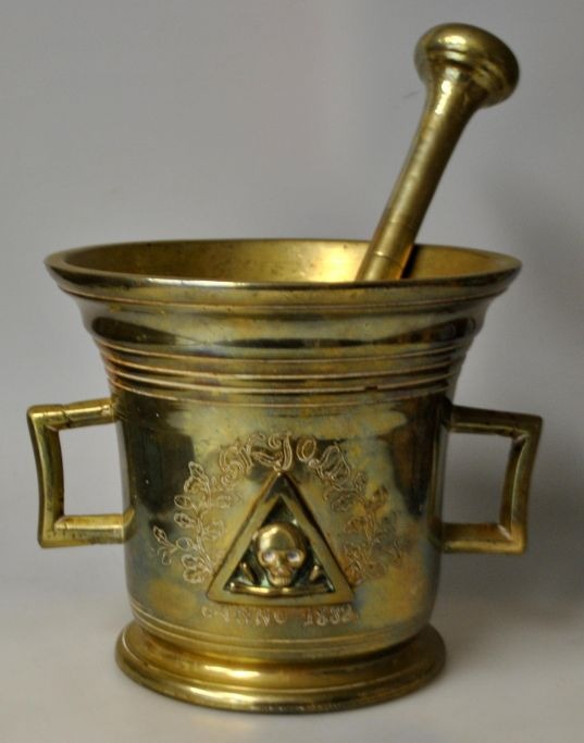 Stor messing apoteker morter fra Svane Apoteket i Randers, 1882. Danmark. Med pistil. Siden dekoreret med trekant, hvori der er en kranie med korslagte knogler. Med indgraveret dekoration med egeløv og navnet: Skjold anno. 1882. Højde.: 15 cm. Dia åbning: 17 cm. Længde pistil: 25,5 cm.Fantastik flot arbejde, som man kan se, har været i brug. Senere antagelig kun benyttet som dekoration.