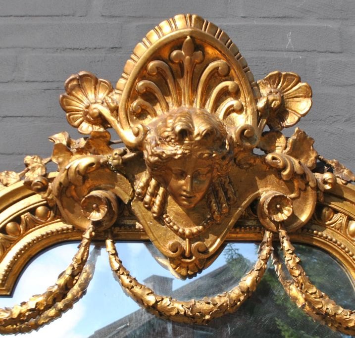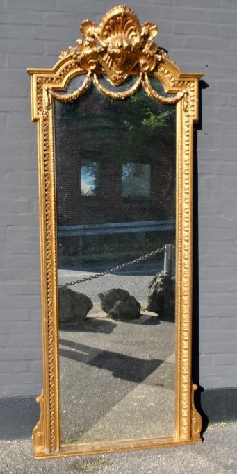 Stort dansk antikt forgyldt spejl, ca. 1870. Med kantdekorationer. Øverst ranker og kvindeansigt. H.: 220 cm. B.: 85 cm.Emne nummer: 28384