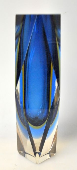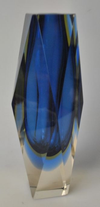 Venetiansk vase - Murano, 1960'erne. Italien. 6 kantet vase. Klart, blåt og gult glas. H.: 20,5 cm.Perfekt stand!