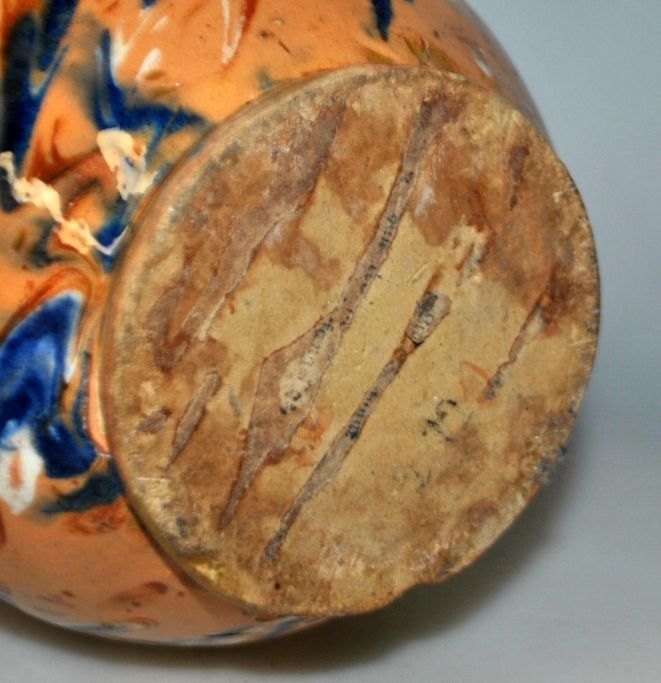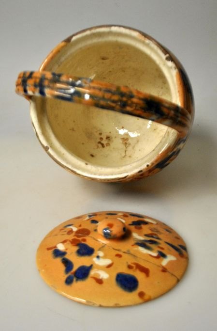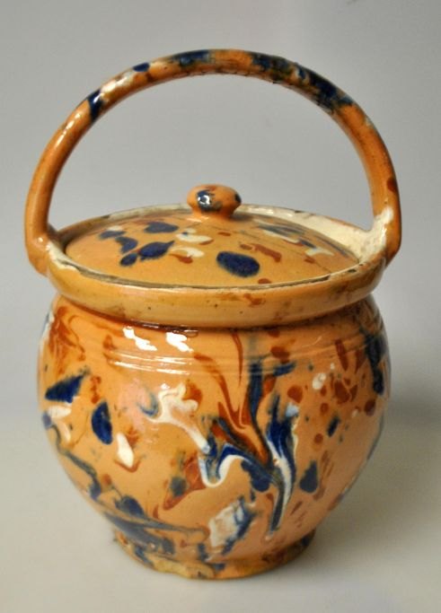 Lille dansk barselsspand, 19. årh. Rødler med glasur i blå, hvide og røde farver. Med hank og låg. H: 21 cm.NB: Låget er limet.