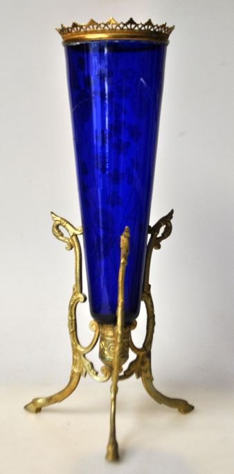 Antik cobolt blå vase med emaljemaleri, 19. årh. Tyskland. Monteret i bronze stativ. H.: 28,5 cm.Emne nummer: 28405