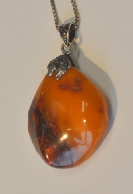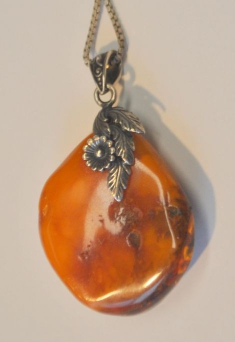 Rav halskæde, N. E. From, Nakskov (efter 1944), Danmark. Poleret rav. OPhæng i sterling sølv med bladværk og blomster. Dertil sterlingkæde, længde: 42 cm. Fra GIFA.Emne nummer: 28206
