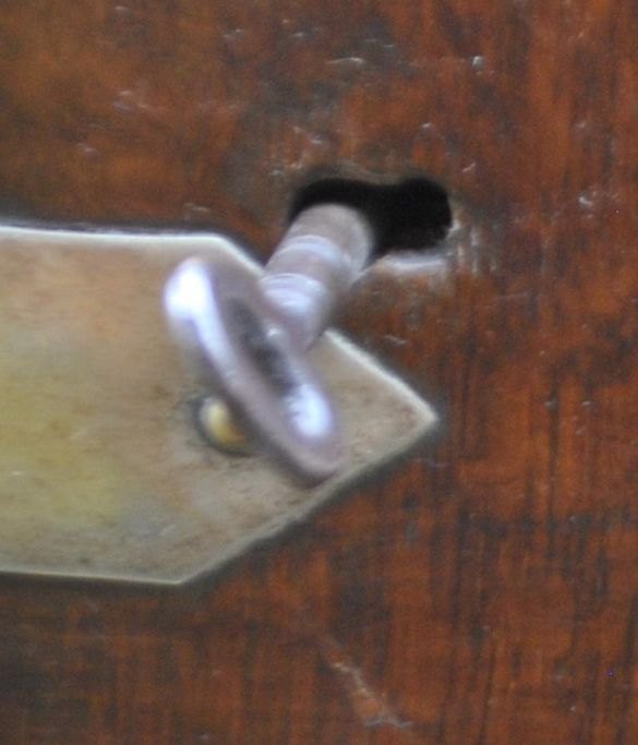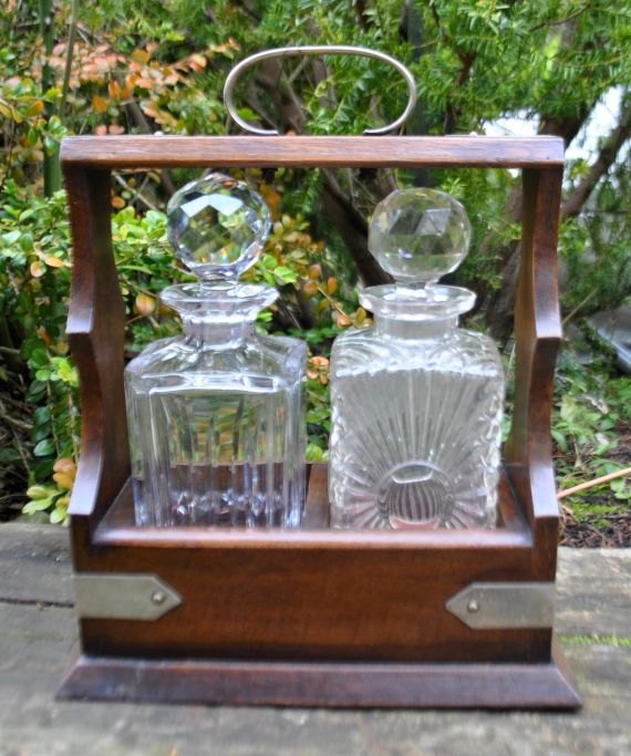 Tantalus af egetræ med to forskellige karafler af krystal med propper. England. 19. årh. Messinghåndtag og -beslag. Sideåbning med lås og nøgle. L: 26 cm. H: 32 cm. Emne nummer: 28420