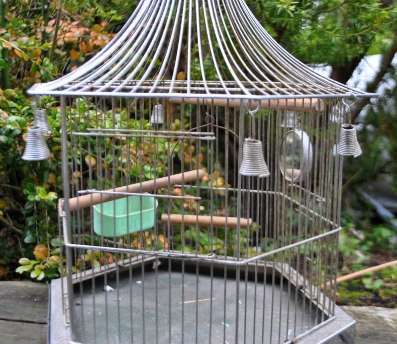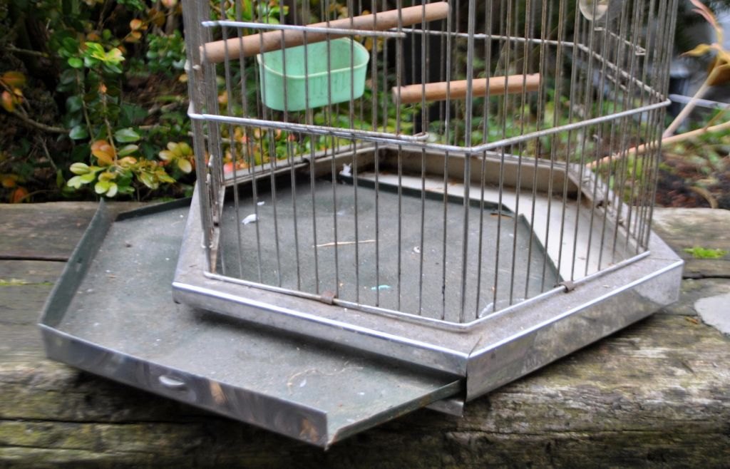 Sekskantet fuglebur i metal, tidlig 20. årh. Med en låge, to skydedøre, to træpinde, spejl, gynge og madtrug. Bund kan trækkes ud som skuffe til rengøring. Inkl. krog til ophængning. H: 45 cm. B: 34 cm.Emne nummer: 28426