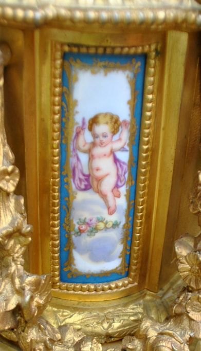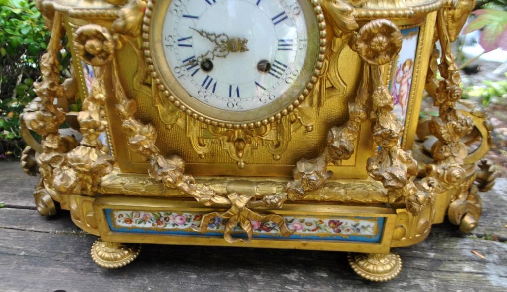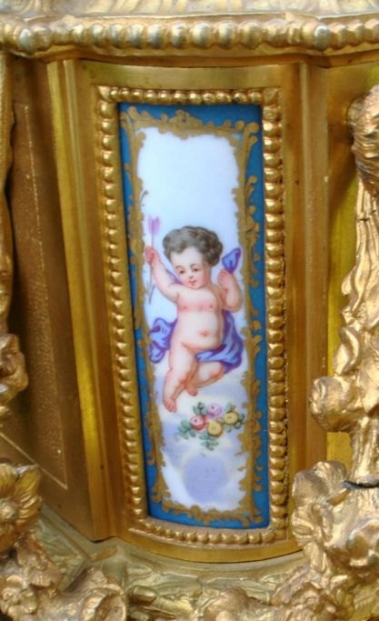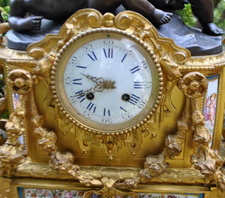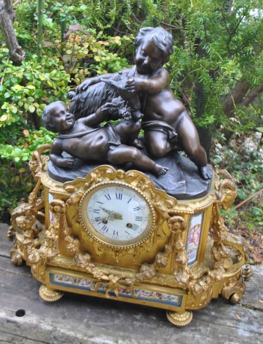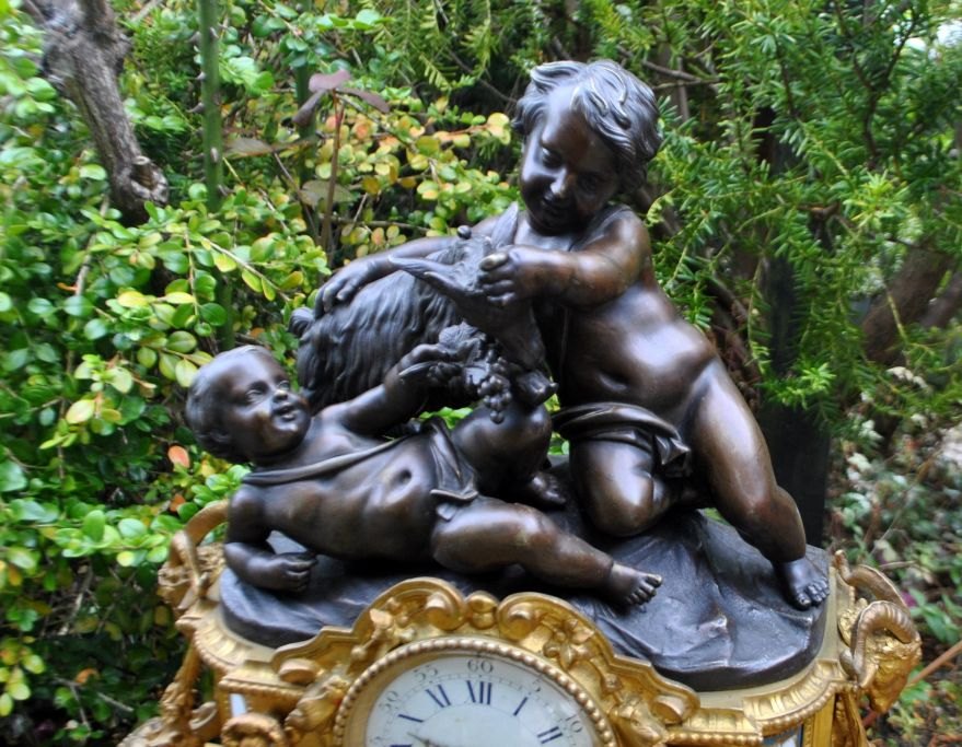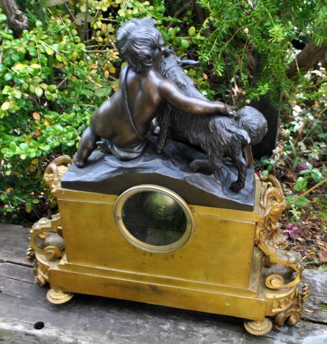 Stort fransk kaminur i bronze, tidlig 19. årh. Topdekoration i form af to putti og en gedebuk. Urhus i lueforgyldt bronze med guirlander og vædderhoveder. Ligeledes porcelæns plaquetter med blomster og putti. Urskive i hvidt emalje med romertal og arabertal. Standart urværk med snorophæng.Emne nummer: 28431