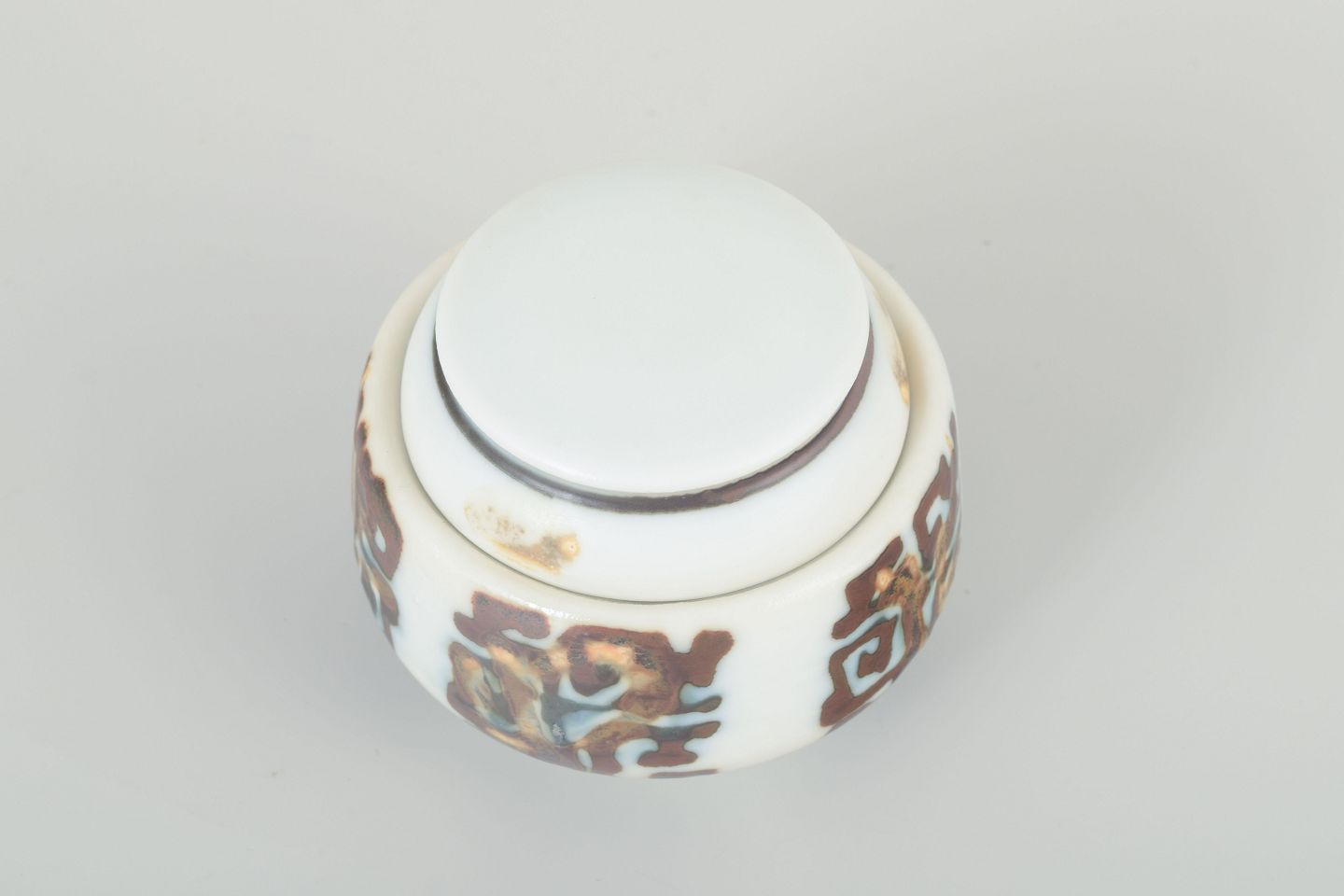 Lille lågkrukke i porcelæn med hvid glasur og abstrakt, reliefagtig dekoration i brunlige og turkise nuancer. Et sjældent og kunstnerisk studiostykke fra Royal Copenhagens eksperimenterende periode i 1960’erne, hvor fabrikkens designere arbejdede med nye glasur- og farveteknikker.