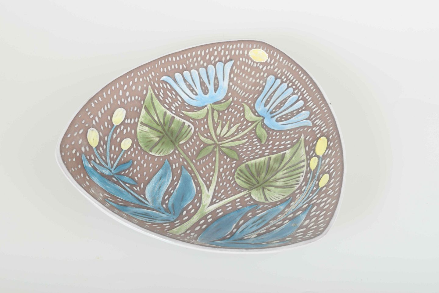 Dekorativt fad i glaseret keramik med reliefmønster af blomster i blå, grønne og hvide nuancer mod brun baggrund.